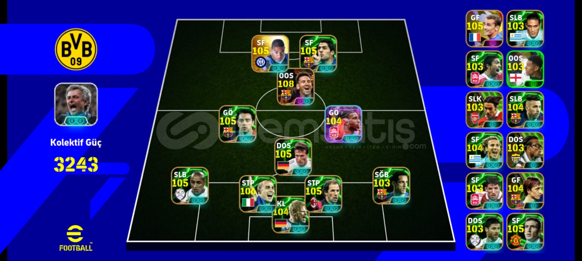 Hesabımın kollektif 3243 gücü bulunmaktadır hesapta 108 Messi 105 Suarez 105 Adriano gibi oyuncular bulunmaktadır hesapta en düşük güçlü oyuncu 103 genlidir.Yeni alıcısına hayırlı olsun.