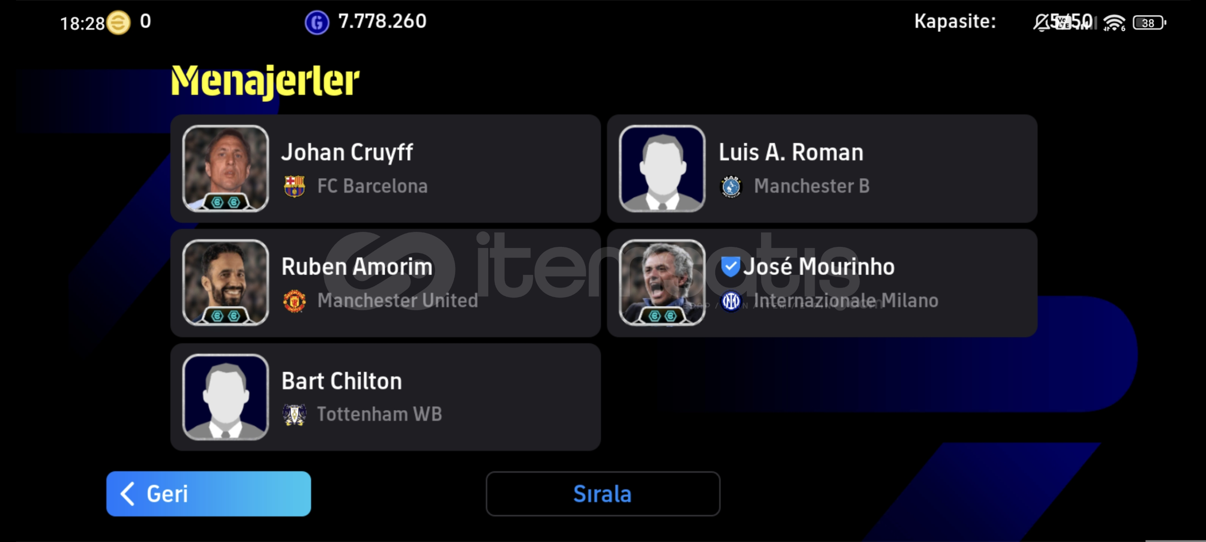 ANDROİD İOS TEK BAĞ -MC YOK 3196 KOLEKTİF GÜÇ PARALI SAĞLAM EPİCLER 105 BAGGİO 105 ADRİANO 105 VAN DİJK 104 PİQUE 107 BELLİNGHAM 103 DE JONGÖZEL MENAJERLER MOURİNHO CRUYF AMORİMGÜZEL REZERV7 MİLYON GPFIRSAT HESABI KAÇIRILMAZ