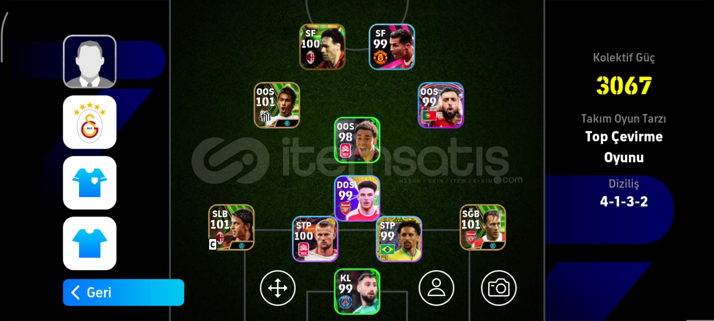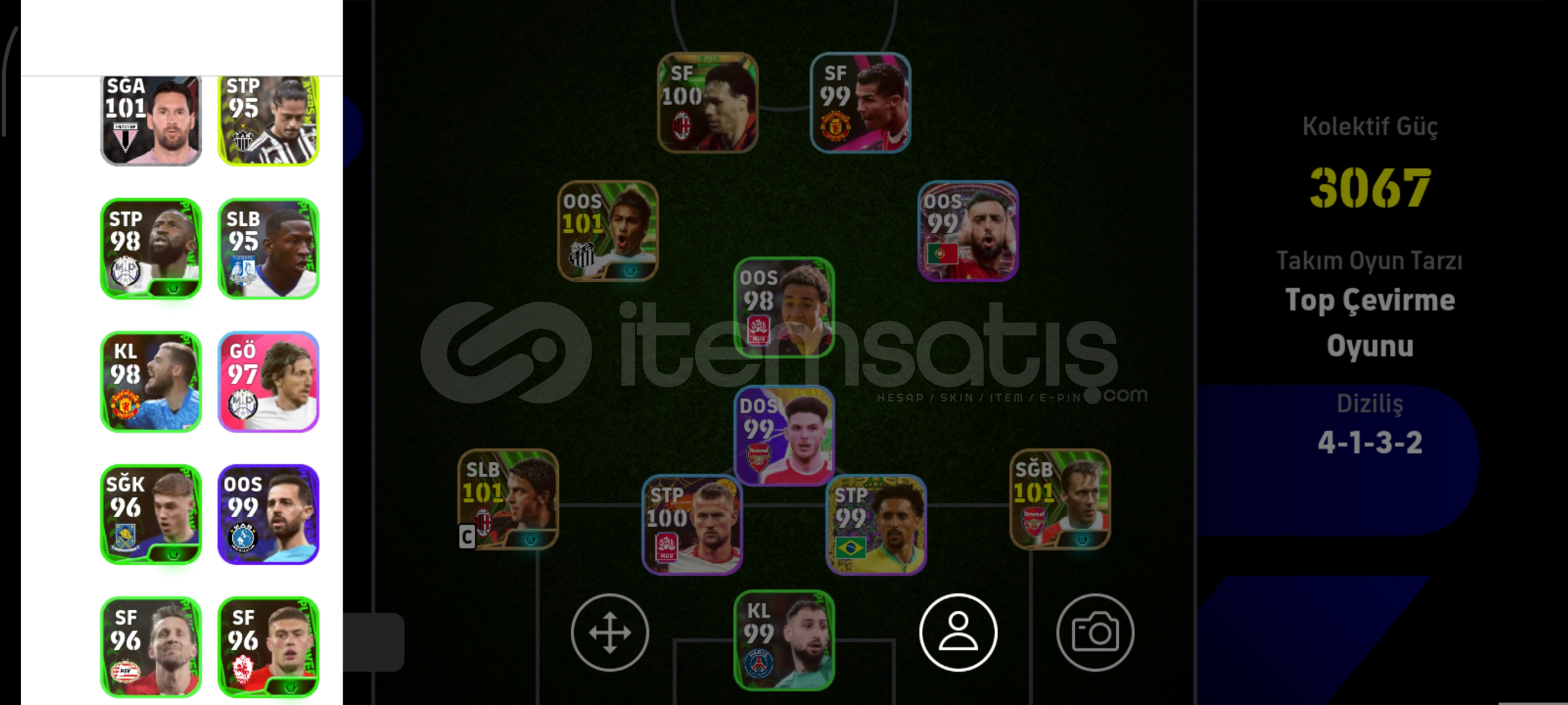 PES (Konami ID’li Hesap)🟩 Takım Gücü: 3067Kadroda bulunan başlıca oyuncular:100 Van Basten99 Cristiano Ronaldo101 Neymar98 K. Musiala99 Bruno Fernandes99 Declan Rice101 A. Costacurta100 De Ligt99 Marquinhos101 Lee Dixon99 DonnarummaHesap Bilgileri:Hesap Konami ID’ye bağlıdır.Satın aldığında Konami ID mail + şifre teslim edilir.Mail ve şifreyi değiştirip hesabı tamamen üzerine alabilirsin...