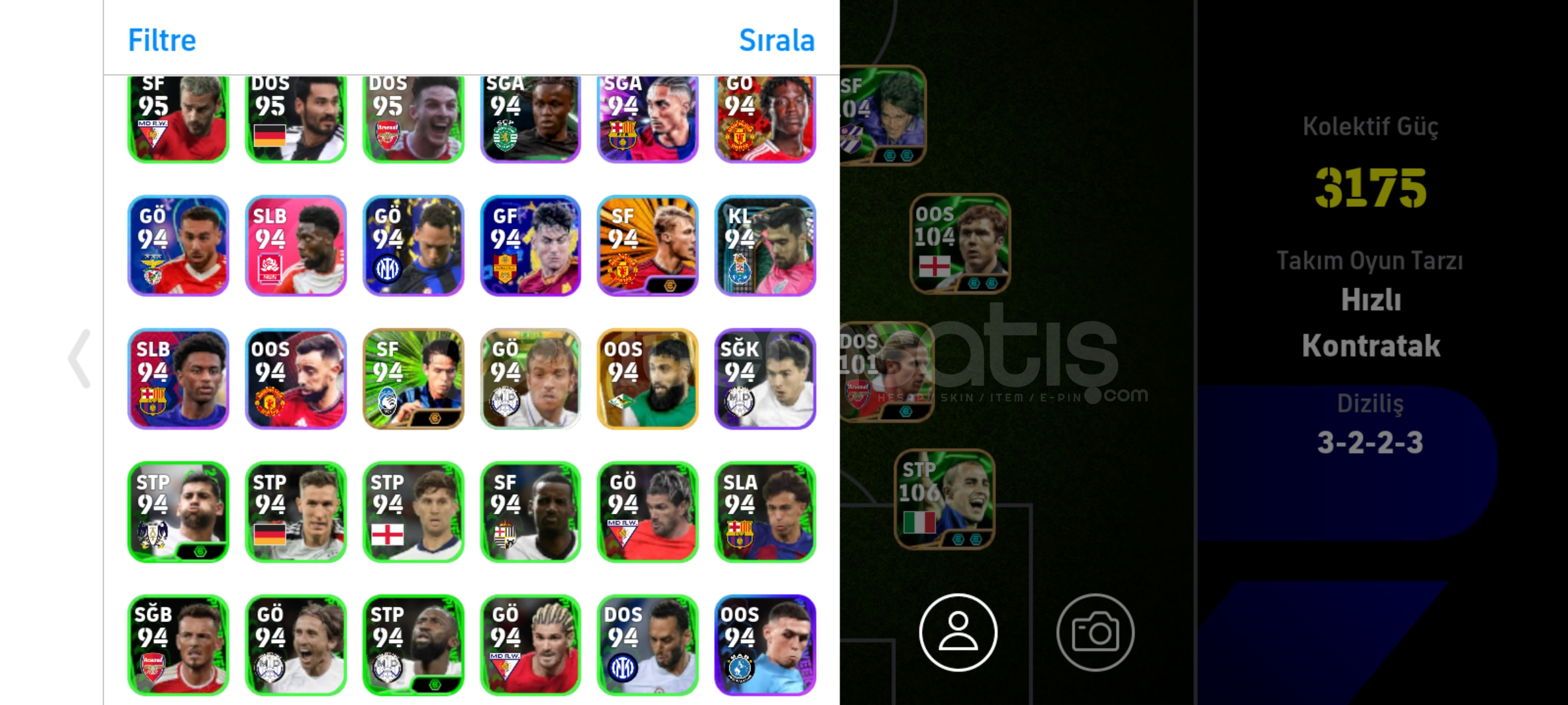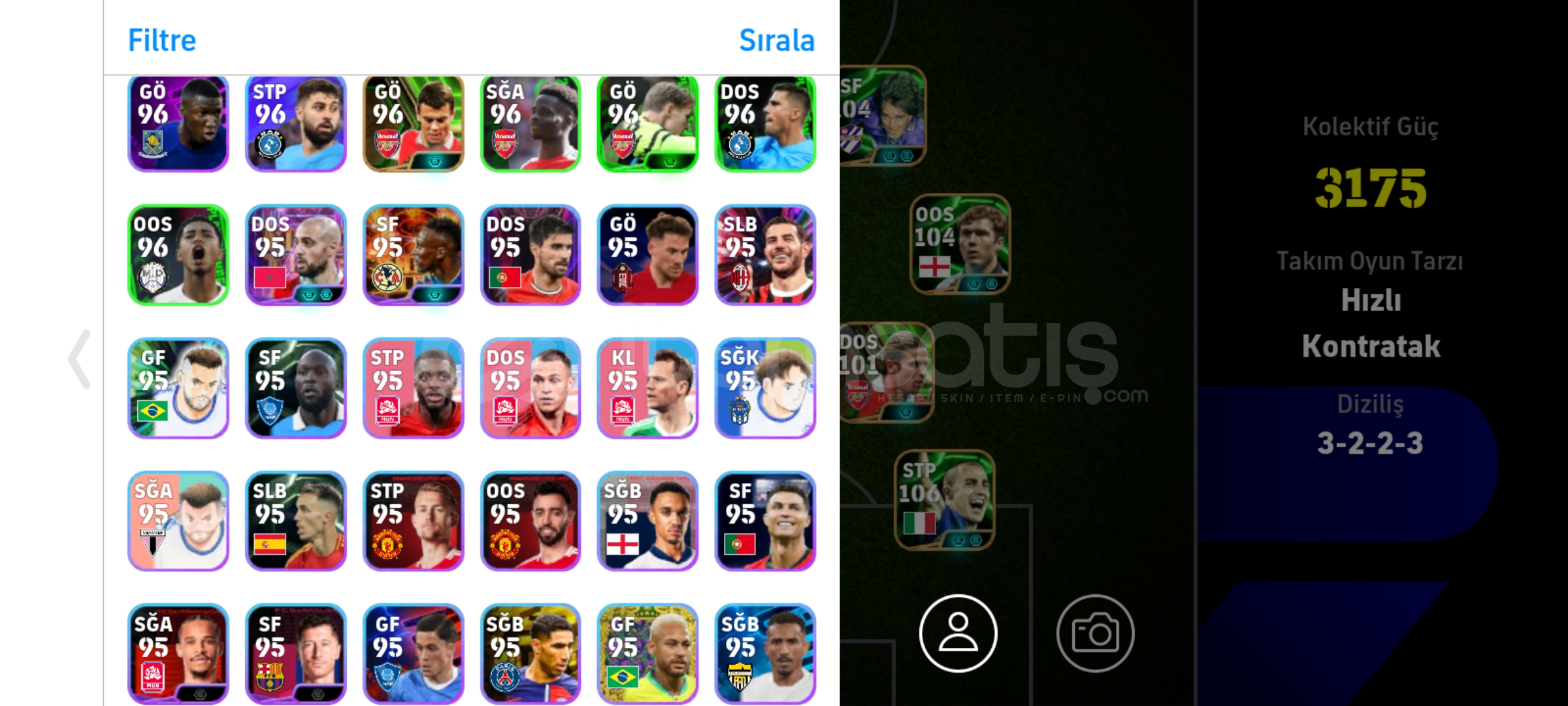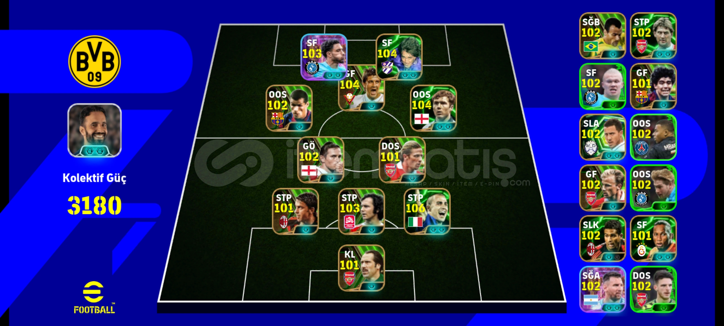 Tek bag sorunsuz hesapRezervi bolDrogba ve batistutaya golcu icgudusu basarsaniz 3182 olurFull eski epiclerden olusan hesapEski hesap kaliteli kartlara sahip uzaktan sut atabilen 7 adet oyuncuya sahipPaul scholesRivaldoBergkampBatistutaDavid villaMarmoushLampardSon fiyattir