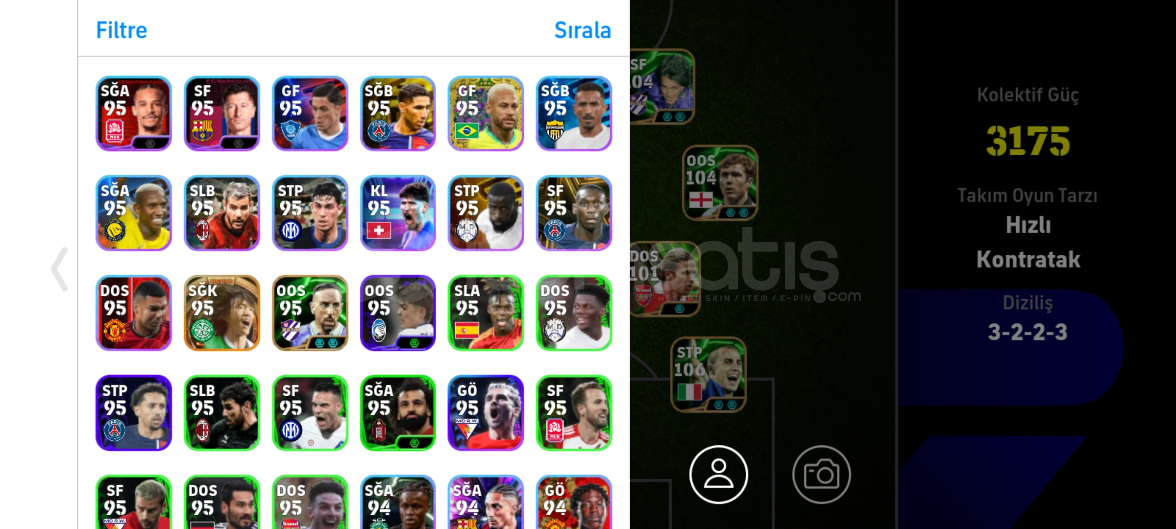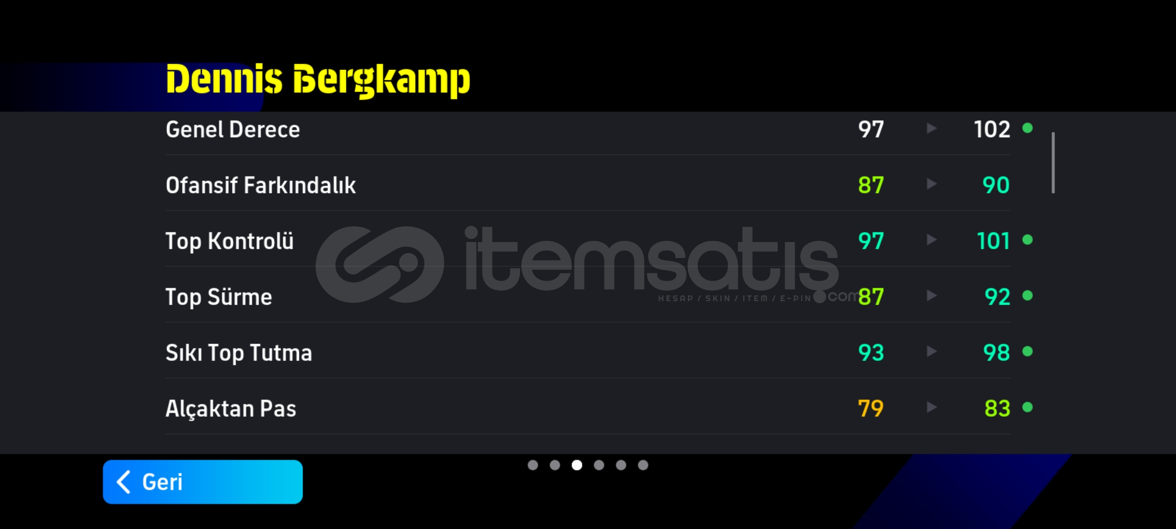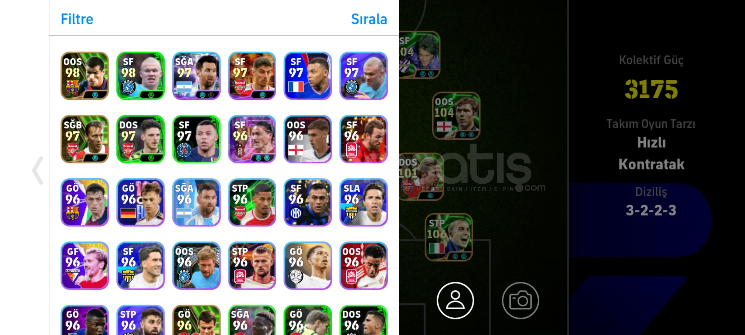 Tek bag sorunsuz hesapRezervi bolDrogba ve batistutaya golcu icgudusu basarsaniz 3182 olurFull eski epiclerden olusan hesapEski hesap kaliteli kartlara sahip uzaktan sut atabilen 7 adet oyuncuya sahipPaul scholesRivaldoBergkampBatistutaDavid villaMarmoushLampardSon fiyattir
