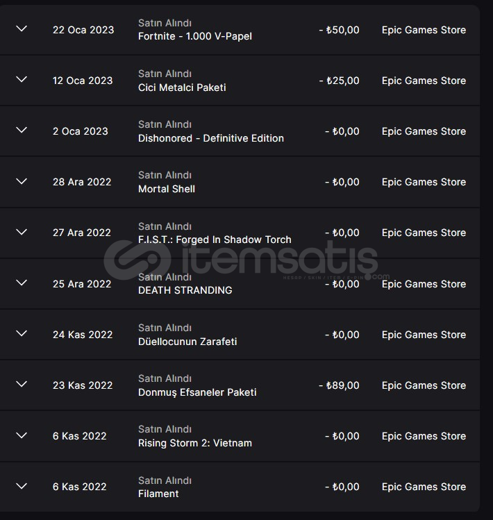Hesapta:Dead StrandingF.I.S.TBlazing SallsDishonoredgibi oyunlar vardır ücretsiz olduğu zamanlarda hesaba ekledim şuanda ücretliler Hesapta Fortnite vardır ve zamanında azda olsa para yatırıp paketler almıştım güzel paketler güzel kostümlerdir.