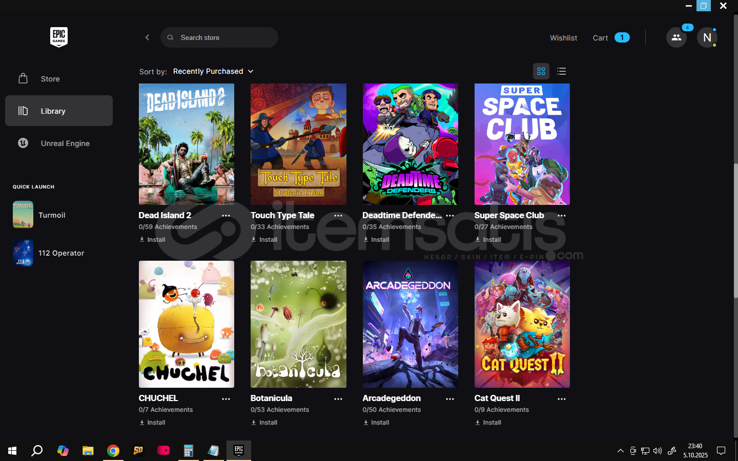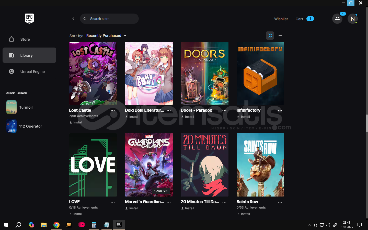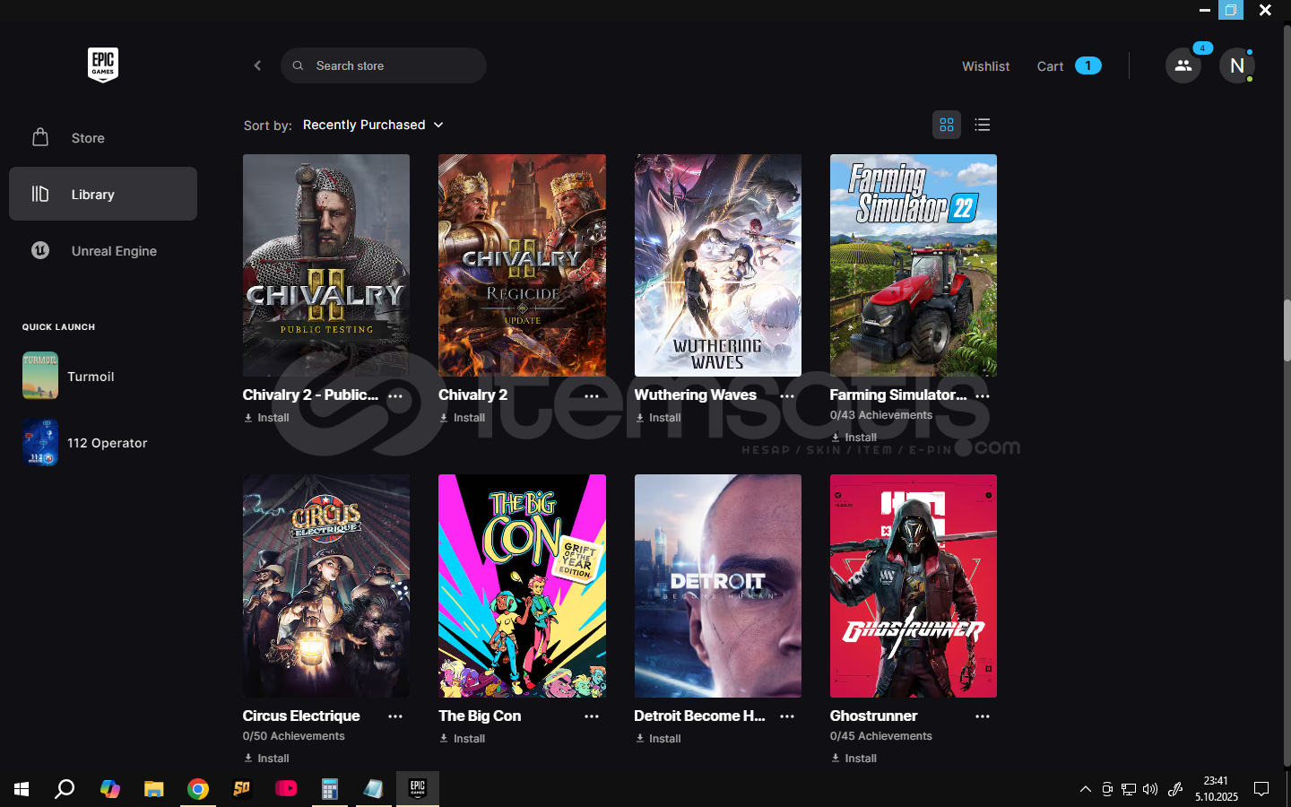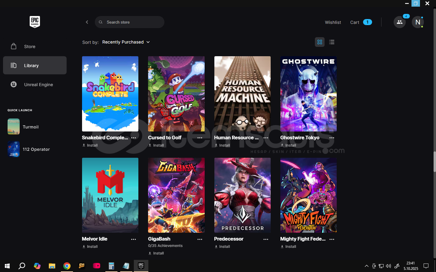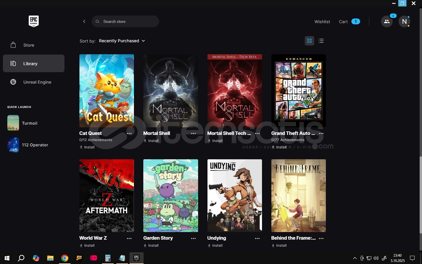 Epic Games'te Gta V'inden Hell let Loose'a kadar ve yanında küçük oyunlar olan bu hesap oyun fiyatları şuanki güncel fiyatlarla hazırlanmıştır oyunları görmek isterseniz fotoğraflara sorunuz olursa bana DM'den ulaşabilirsiniz.Fotoğraf yetmediğinden dm den bütün oyunların ekran görüntülerini size atabilirim.