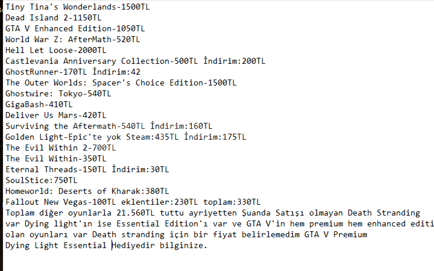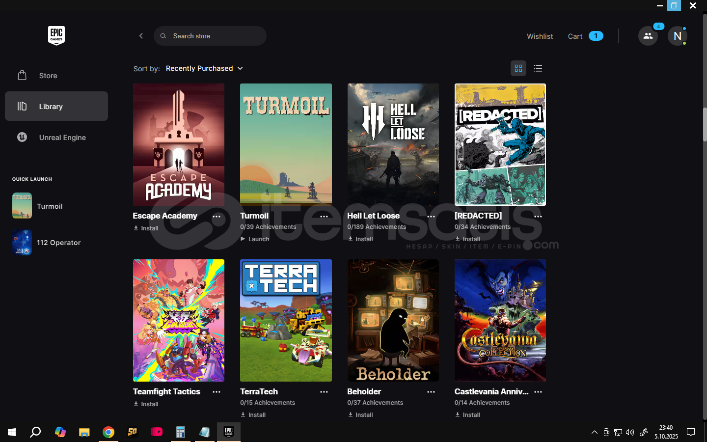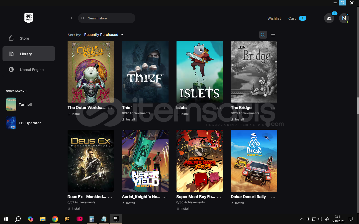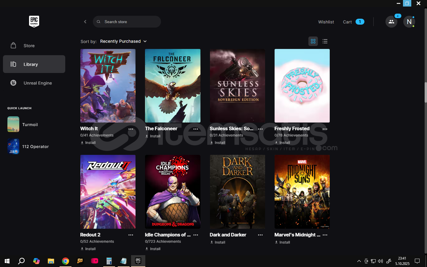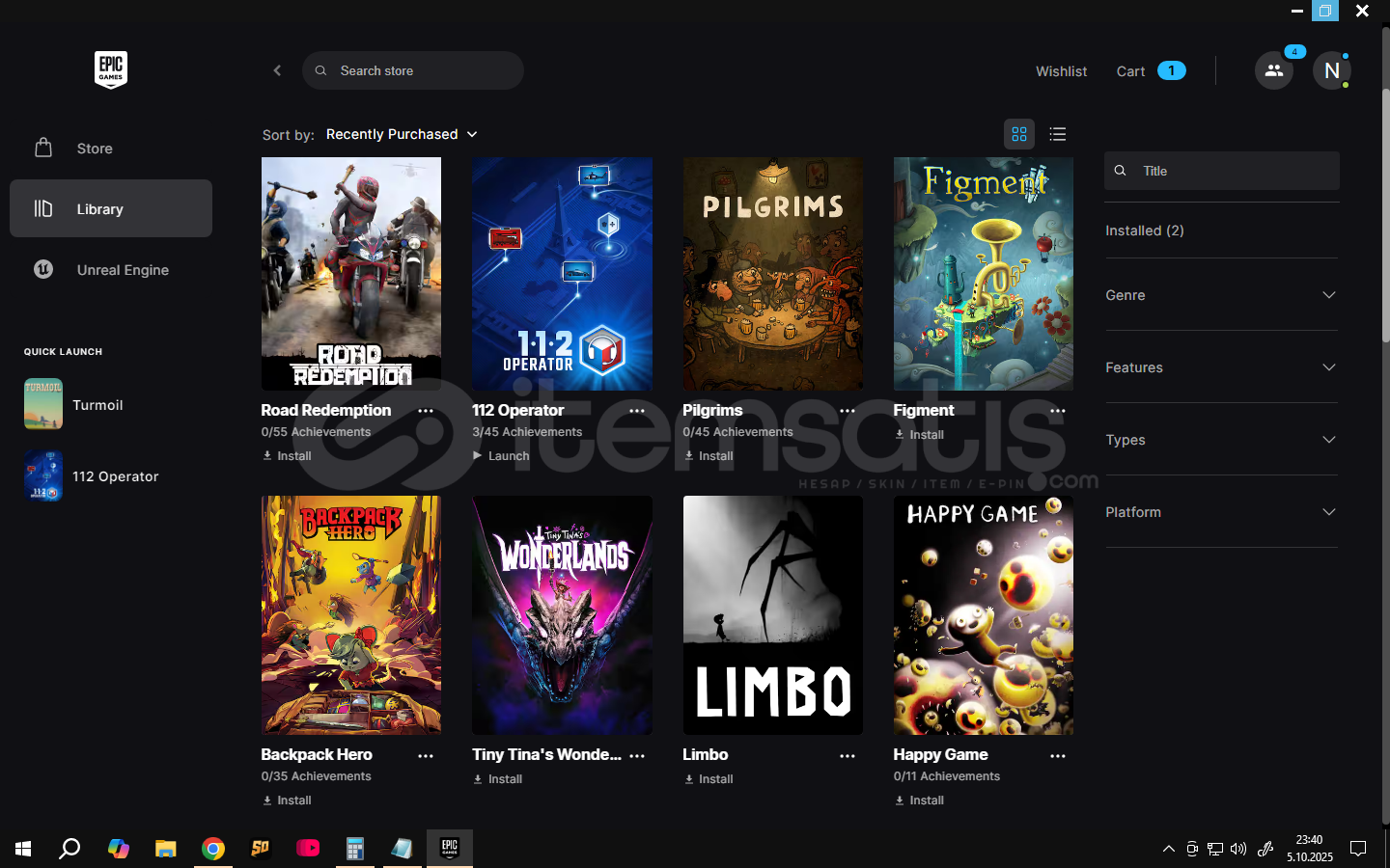 Epic Games'te Gta V'inden Hell let Loose'a kadar ve yanında küçük oyunlar olan bu hesap oyun fiyatları şuanki güncel fiyatlarla hazırlanmıştır oyunları görmek isterseniz fotoğraflara sorunuz olursa bana DM'den ulaşabilirsiniz.Fotoğraf yetmediğinden dm den bütün oyunların ekran görüntülerini size atabilirim.