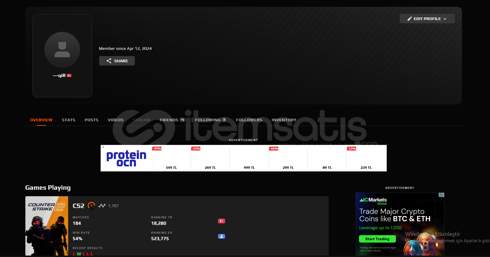 Hesapta 185 match %54 win rate 1.70+ kd average bulunmaktaPAZARLIK SUNNETTIRSteam hesabında Cs 2500+ saatSteam Pazar banı kalkmıştır skin alıp faceitte oynayabilirsiniz fakat hesap PRIME degildir