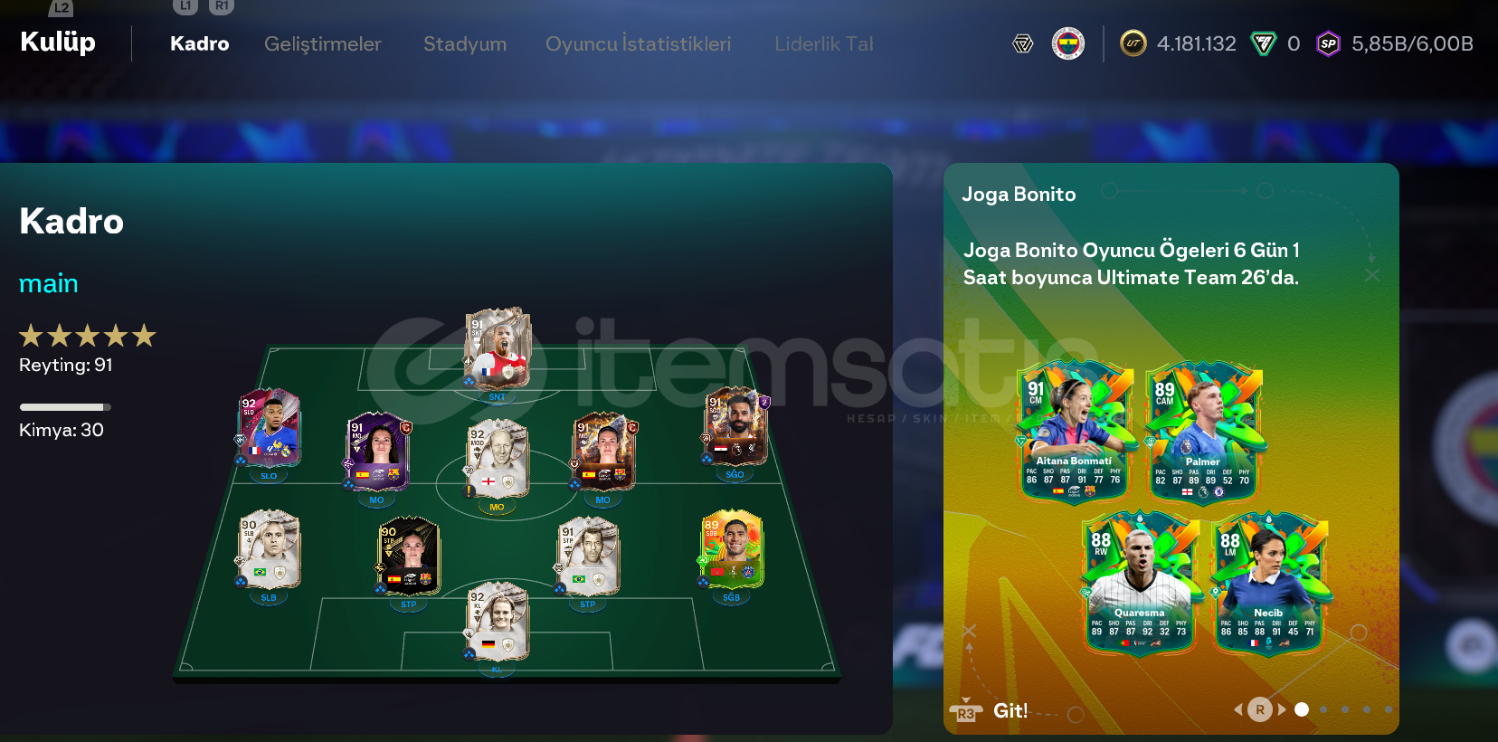 4 M coin li kadro değeri +20 m eden KKG si dolu hesap. Mevcut kartlar +200 k lık 20 den fazla oyuncu mevcut. Kartların bir çoğu satılamaz. Pc hesabı aylık EA PRO üyelik. Hesabın derecesi div 5 olup ciddi alıcılarla görüşüp fikir değerlendirilir.