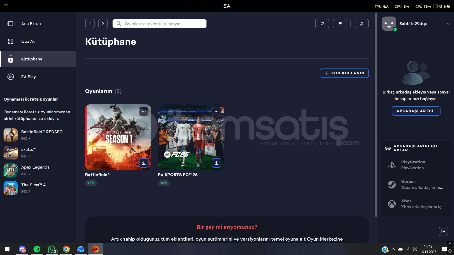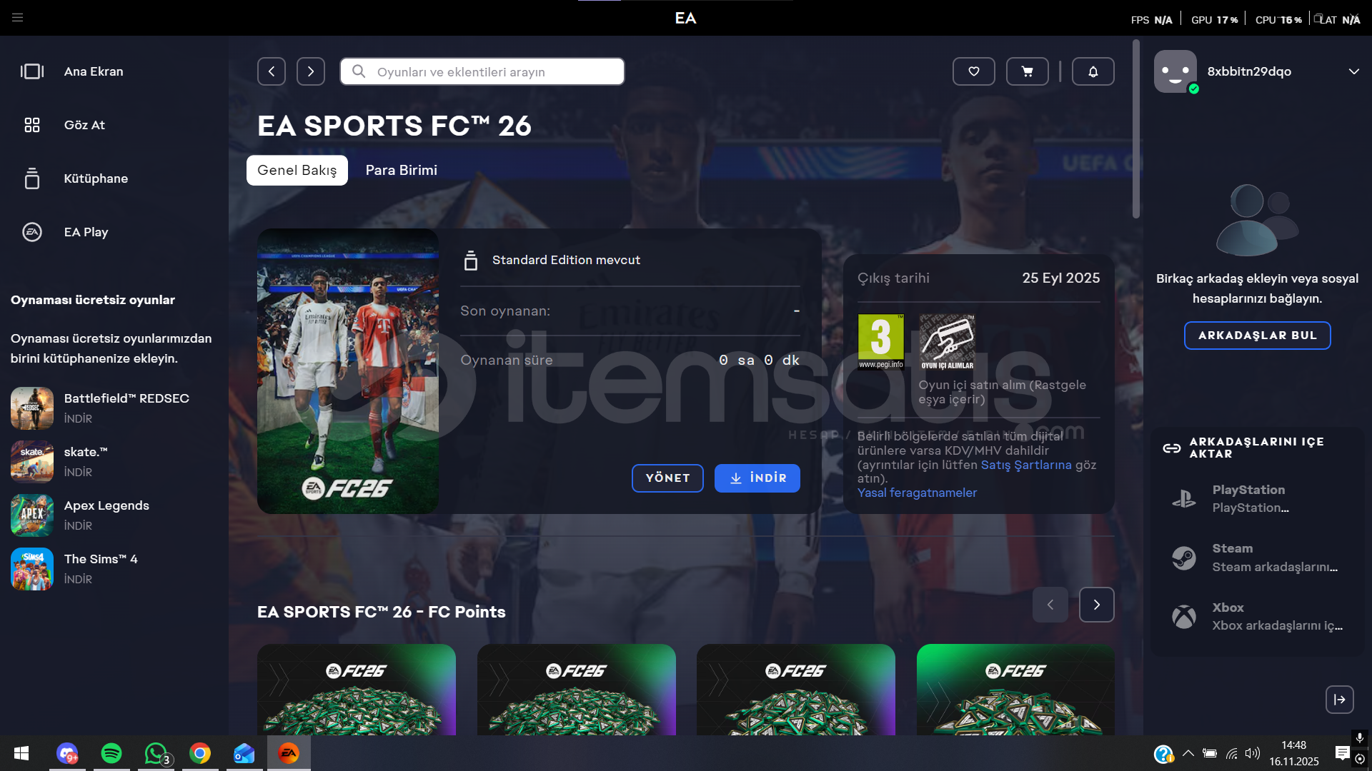 HESABIMIZ İTEMSATIŞ'IN SAYILI İLANLARINDAN OLUP "FC26 VE BATTLEFİELD 6" BULUNAN BİR EA PLAY HESABI İLE SİZLERE TESLİM EDİLECEKTİR