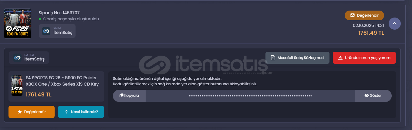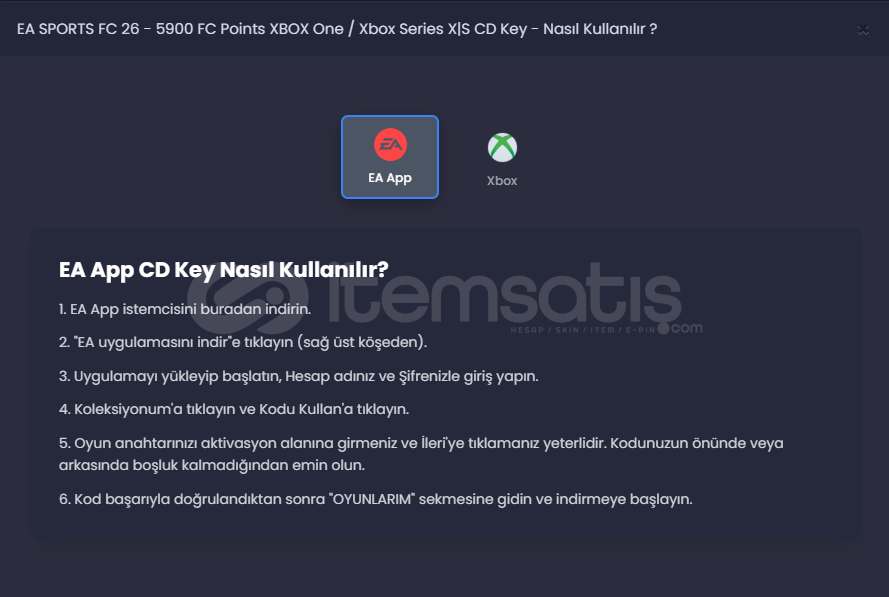 xbox FC26 oyuncuları için 5900 FP ucuz fiyata veriyorum kod hiç kullanılmadı herhangi bir sorun da iletişime geçilecek her türlü yardım sağlanacaktır. Bu fiyata satılmasının temel sebebi alınan kodun xbox için olduğu anlaşılmış PC üzerinden kullanılmadığı için zarardan da olsa satışının yapılmasına karar verildi bu sebeple ucuz fiyata alacak arkadaşımıza direkt teslim edilecektir. tek kullanımlık olduğu için lütfen herhangi bir dolandırma çabasına girmeyiniz. çünkü kodun kullanılmadığı kesindir. 1761 TL değerindeki bu kodu 1500 TL'ye veriyorum maksat elimden çıksın xbox sahibi olmadığımdan dolayı.