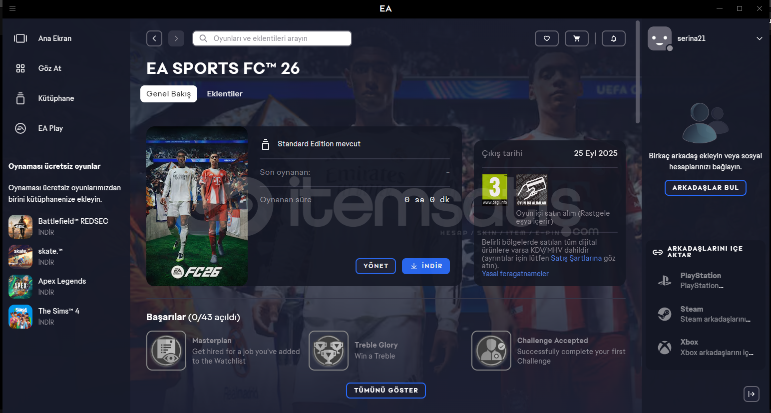 HESABIMIZ İTEMSATIŞ'IN SAYILI İLANLARINDAN OLUP FC26 BULUNAN BİR EA PLAY HESABI İLE SİZLERE TESLİM EDİLECEKTİR