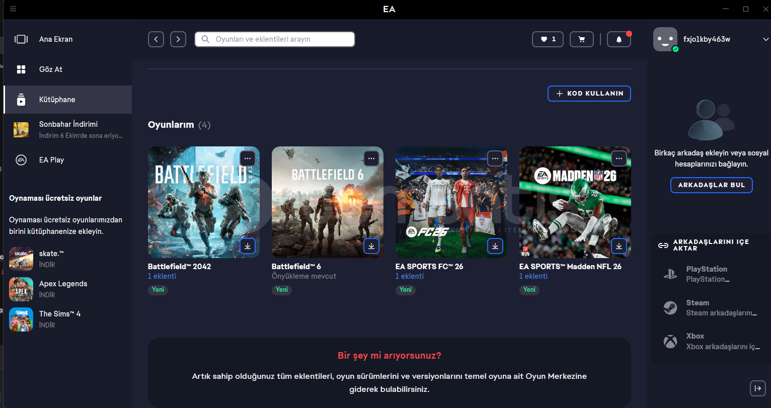 • Oyunlar: Battlefield 2042 , Battlefield 6 , EA SPORTS FC 26 , EA SPORTS Madden NFL 26