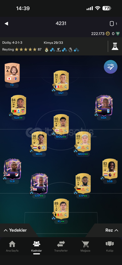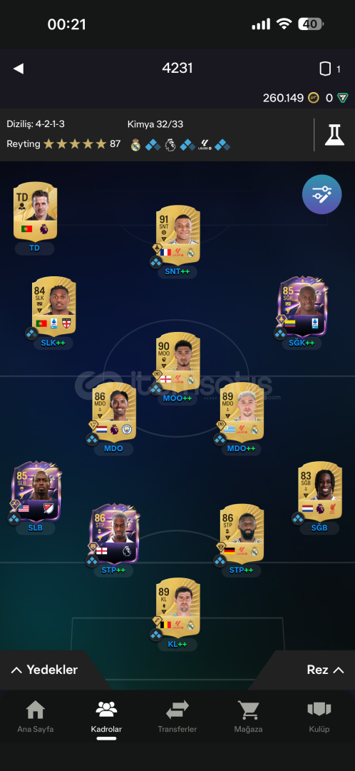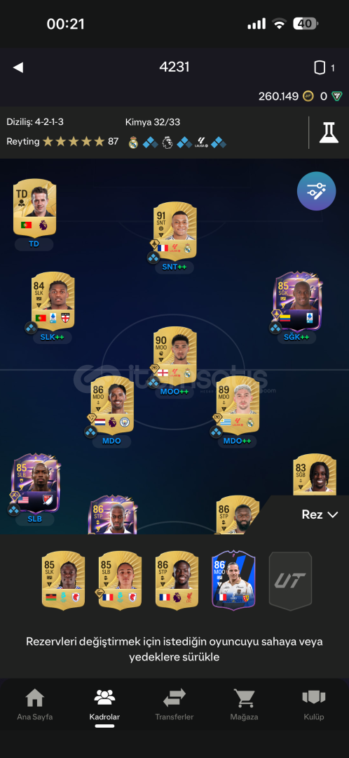 Hesapta birçok iki oyuncu vardır yaklaşık kadro degeri 4 milyon coin vardır ön sipariş olarak alındıgı için kasım başında 2000 fp eklenecektir su ana kadarli görevler ve sbclerin çoğu yapılmış olup altın olmayan oyuncuların tamamı durmaktadır. Mbappe courtua alison pacho king ibarbo gibi pahalı oyuncular vardır ilgilenenler iletişime geçebilir.Pazarl...