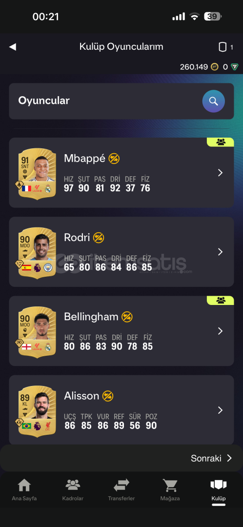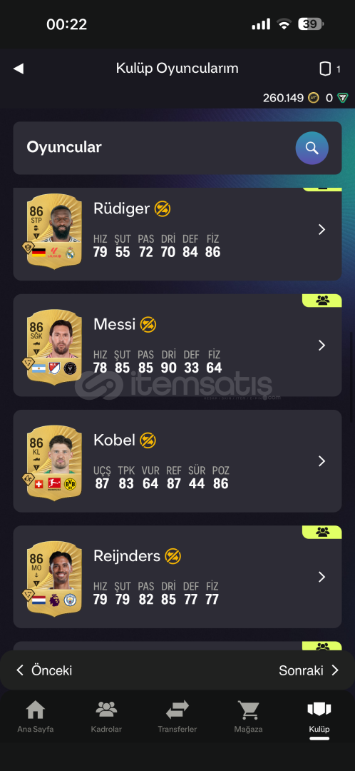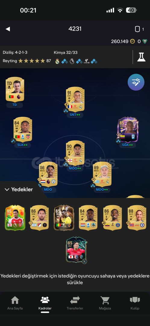 Hesapta birçok iki oyuncu vardır yaklaşık kadro degeri 4 milyon coin vardır ön sipariş olarak alındıgı için kasım başında 2000 fp eklenecektir su ana kadarli görevler ve sbclerin çoğu yapılmış olup altın olmayan oyuncuların tamamı durmaktadır. Mbappe courtua alison pacho king ibarbo gibi pahalı oyuncular vardır ilgilenenler iletişime geçebilir.Pazarlık payı vardır. Hesap şansı çok yuksektir transfer listesiyle birlikte yaklasık 300 k coin vardır.