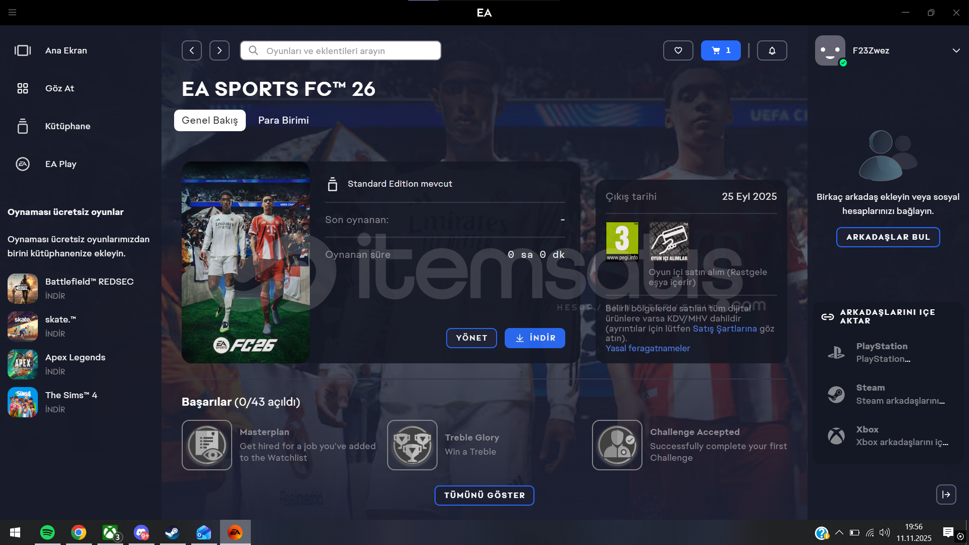 HESABIMIZ İTEMSATIŞ'IN SAYILI İLANLARINDAN OLUP FC26 BULUNAN BİR EA PLAY HESABI İLE SİZLERE TESLİM EDİLECEKTİR