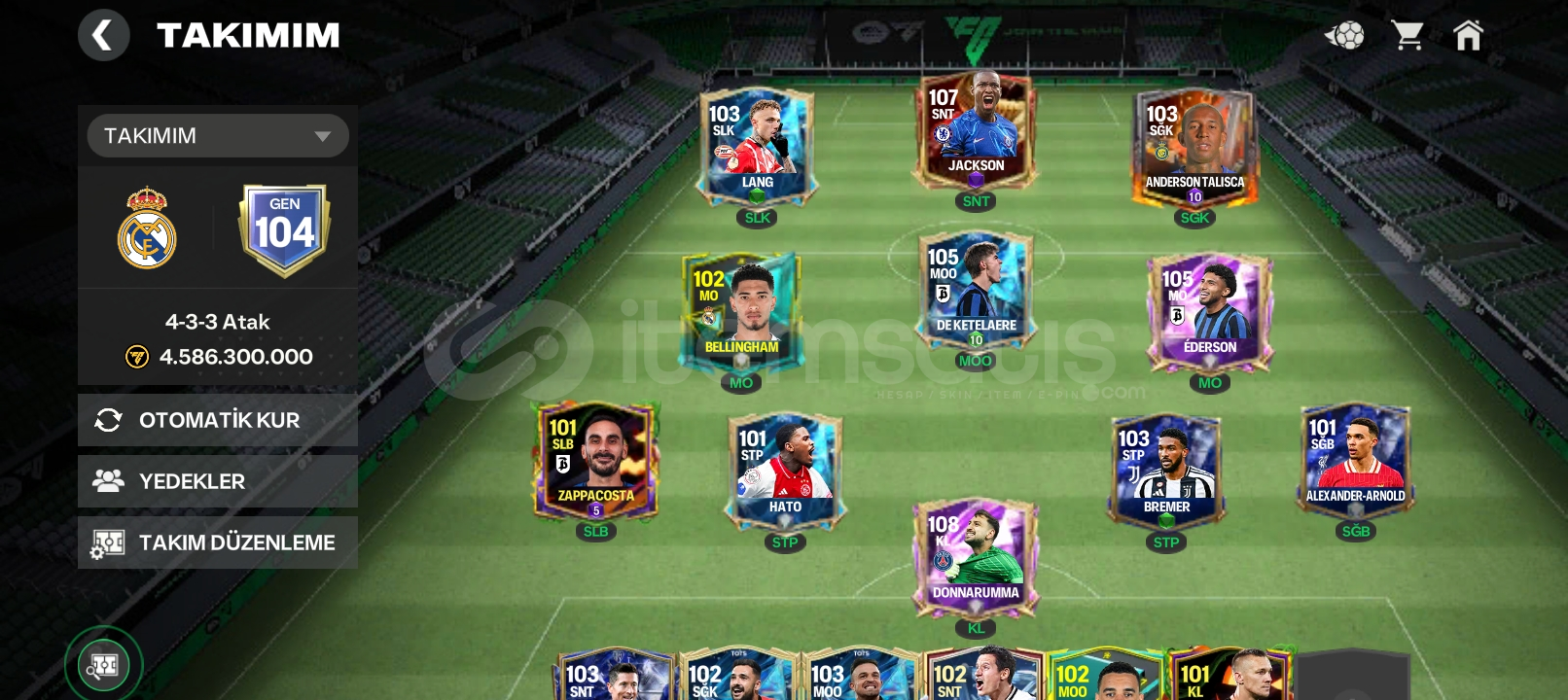 Fiyat hakkında konuşabiliriz. 📌 GEN: 104📌 Diziliş: 4-3-3 Atak📌 Kadronun Tahmini Değeri: 4.586.300.000🔝 Öne Çıkan Oyuncular:Donnarumma (108 OVR, Kaleci)Jackson (107 OVR, Forvet)Ederson (105 OVR, Orta Saha)De Ketelaere (105 OVR, Orta Saha)Bremer (103 OVR, Stoper)Anderson Talisca (103 OVR, Sa...