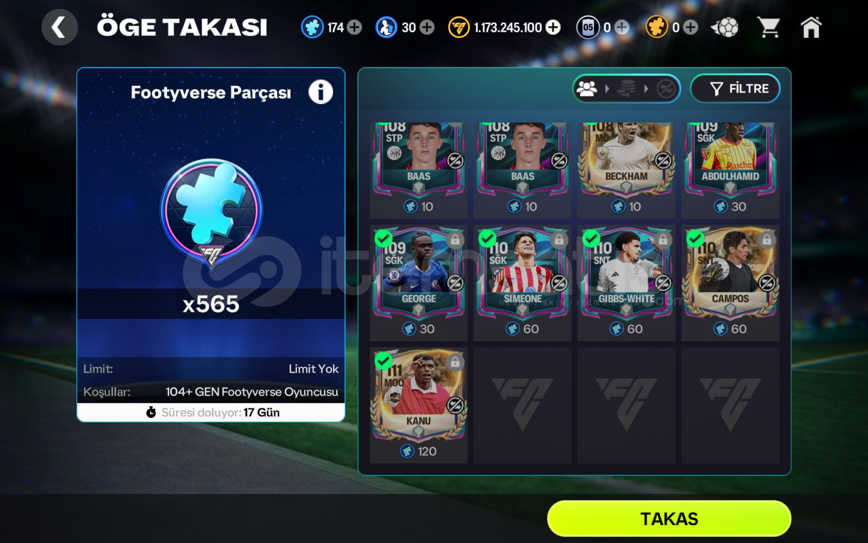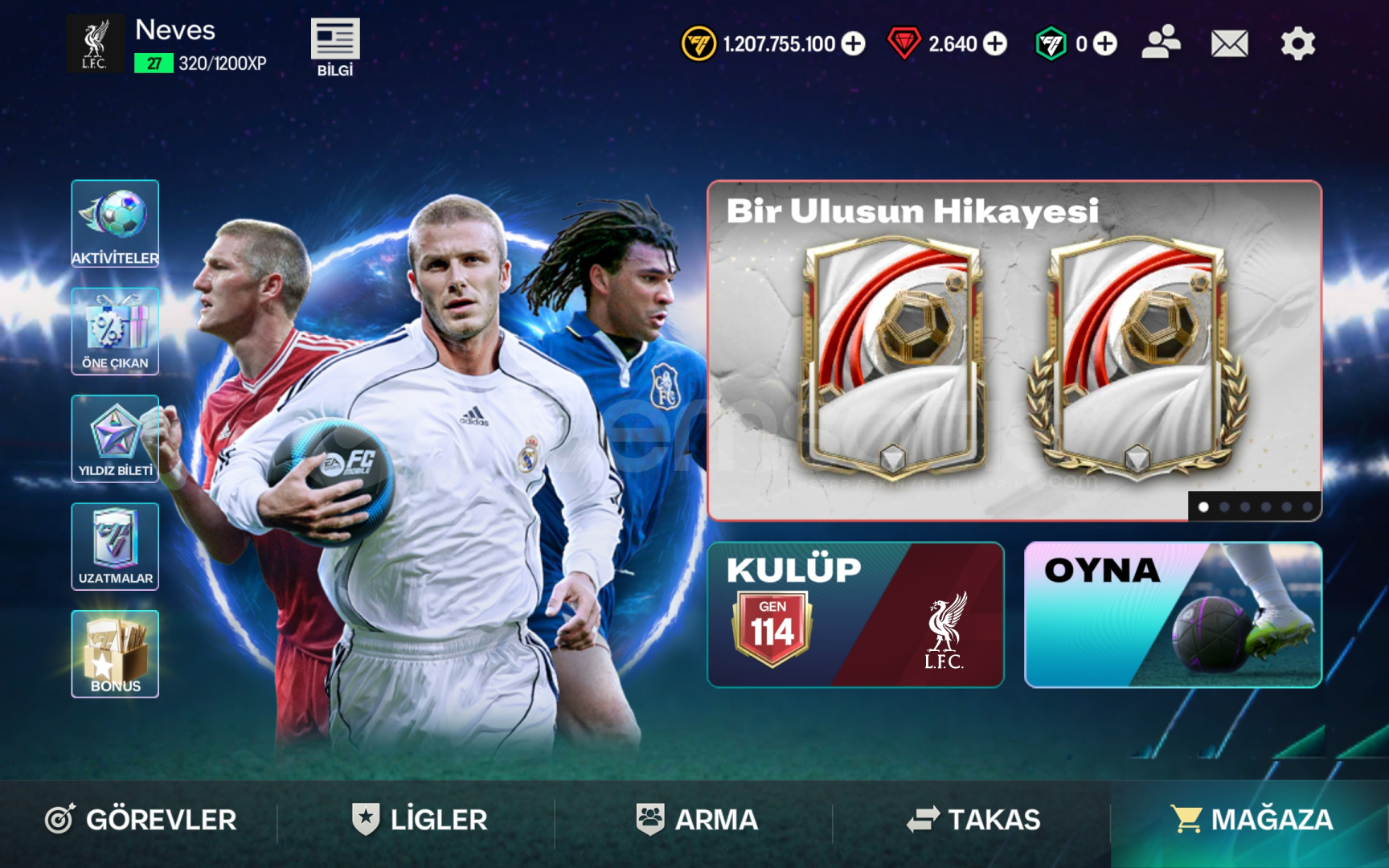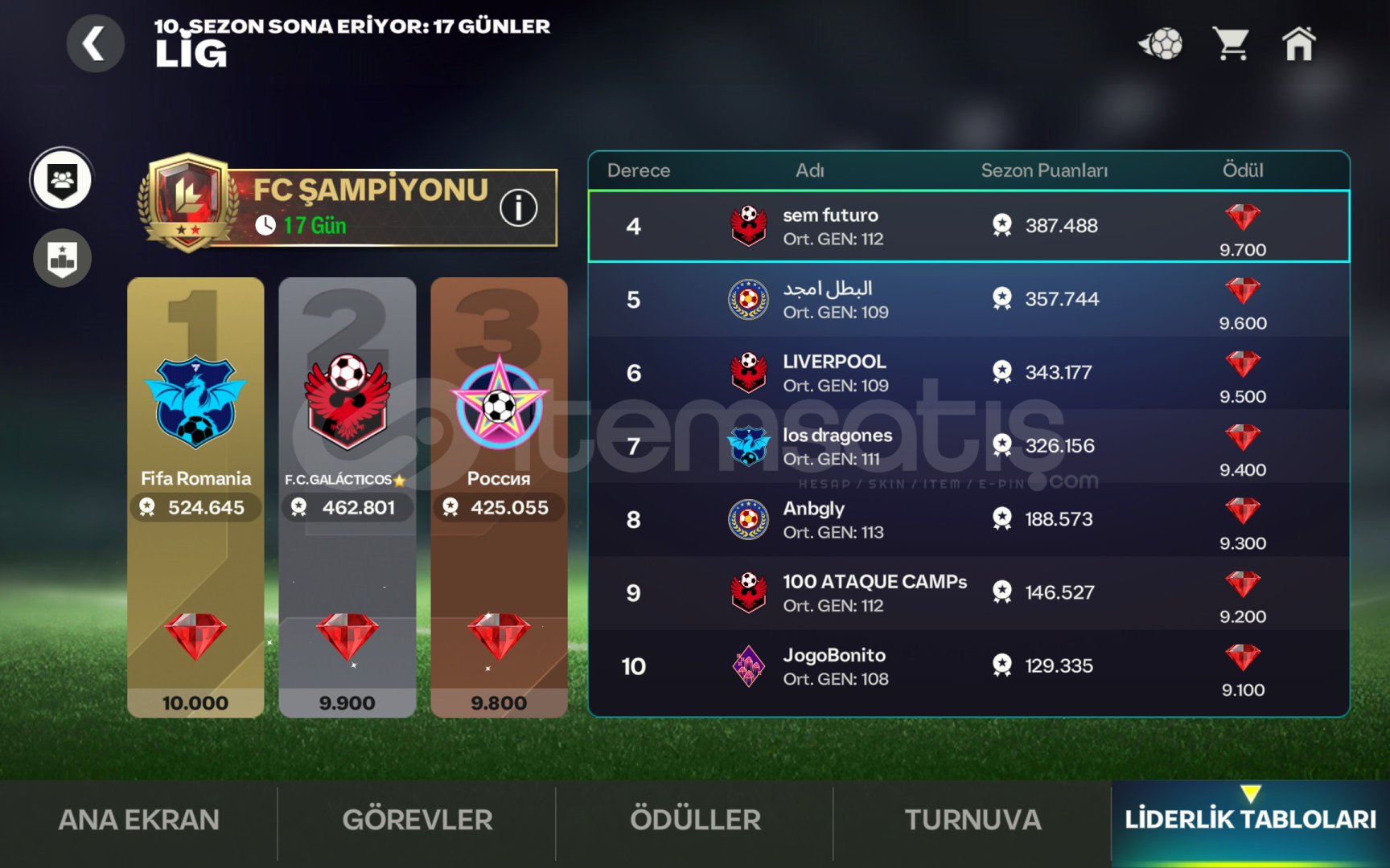114 gen 1,2 milyar coins 750 fotyverse parçacığı 480 bir ulus hikayesi parçacığı fc şampiyon seviyesinde lig her hafta 9700 cevher veriyor fc şampiyon KA ve divilsion rivals ta 2800 cevher veriyor her hafta sitenin en uygun hesabı .