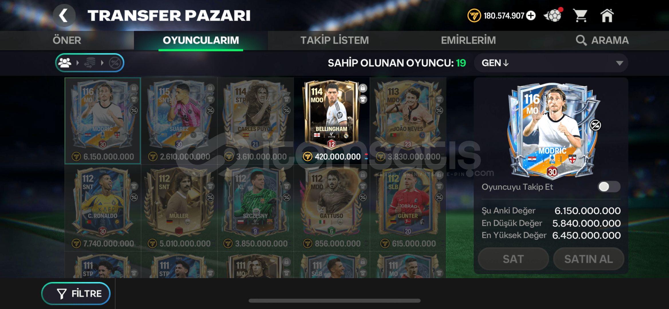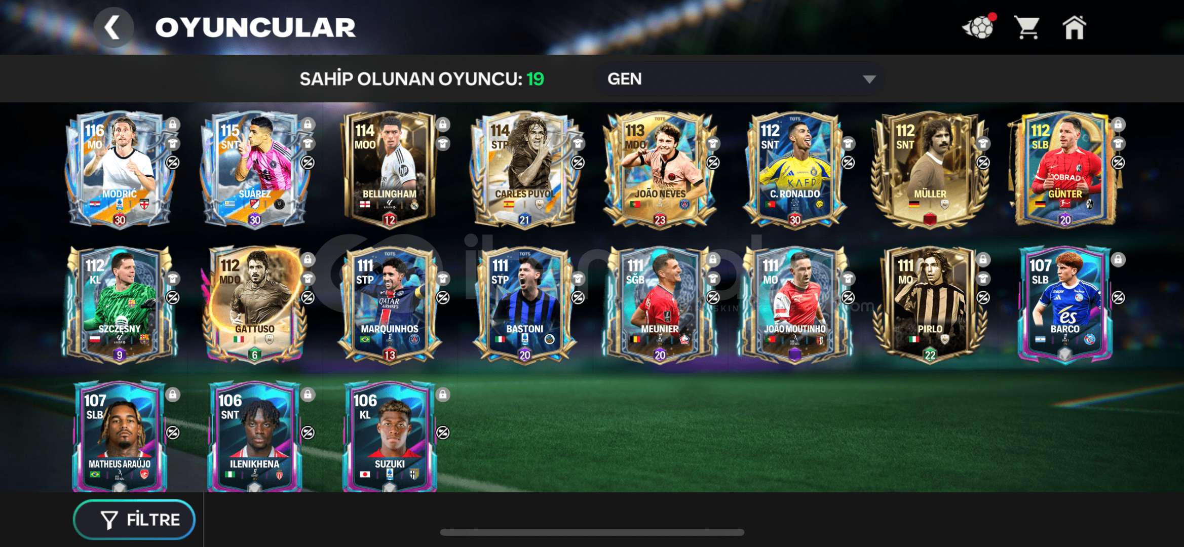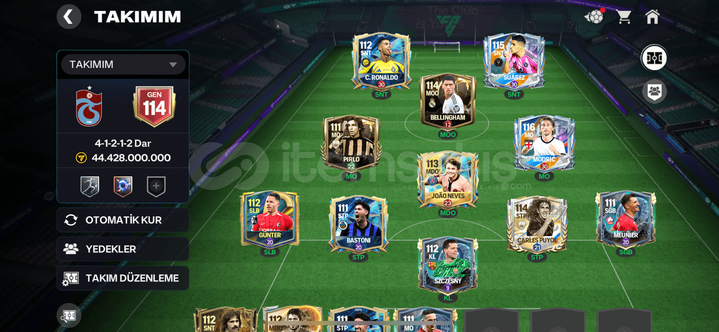 55 Seviye 44 milyar kadro değeri var fotoğraflarda görüldüğü gibi anlık değeri 5 milyar olan 116 gen modric 3.5 milyar olan 114 gen carles puyol 2.5 milyar olan 112 gen c. ronaldo 2.5 milyar olan 115 gen suarez mevcut bunun dısında satılabilir bellıngham mevcut 180 milyon nakit yani toplam 600 milyar coin var hesaptaki oyunculara tek tek bakabilirsiniz çoğu meta oyuncular ve aşırı pahalı oyuncular en son gelen oyunun son geni 113 gen olan modric var hesapta daha ne olsun tertemiz hesap