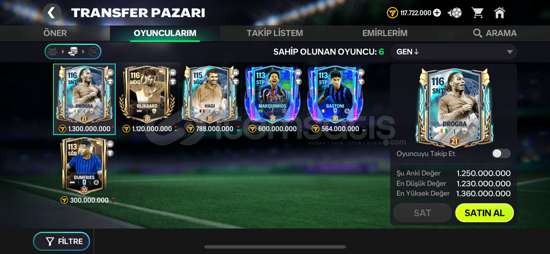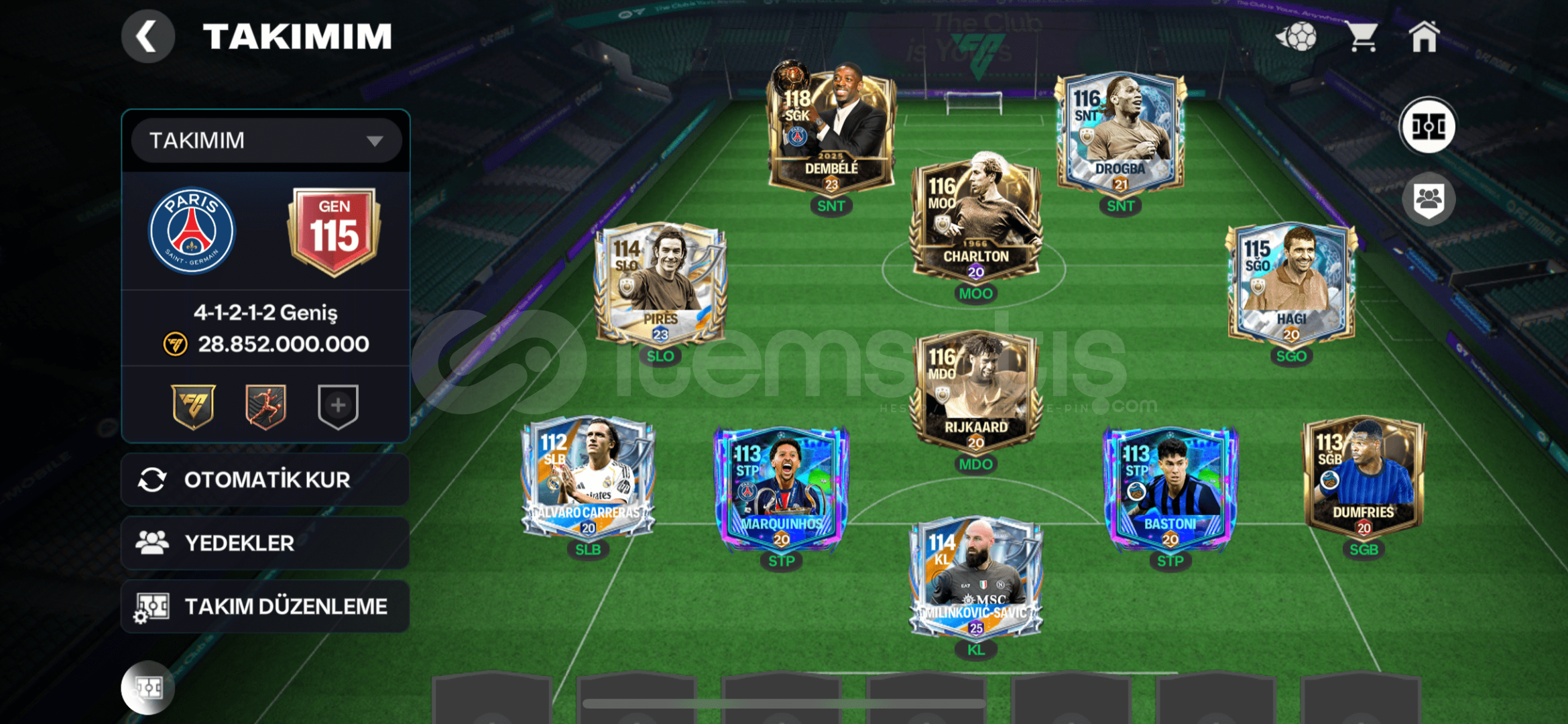 hesapta maç gen CHARLTON ve DEMBELE vardır satılabilir oyuncuların değeri 4 milyar coinstir isterseniz şeşkoyu kadroya alıp drogbayı satabilirsiniz gen düşmez tek bağ ea mailiyle beraber teslim edilecektir pazarlık payı vardır