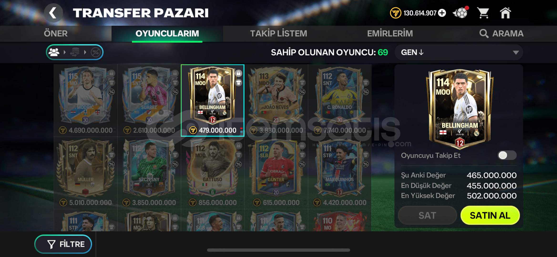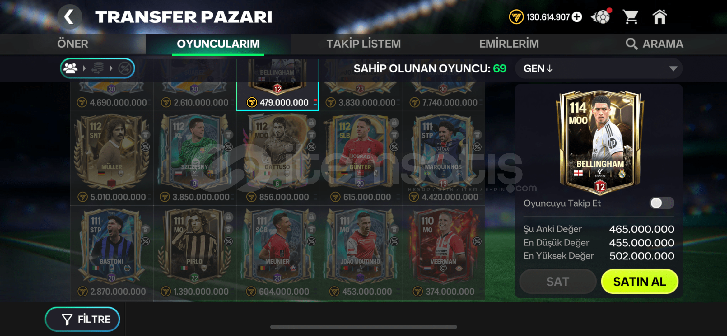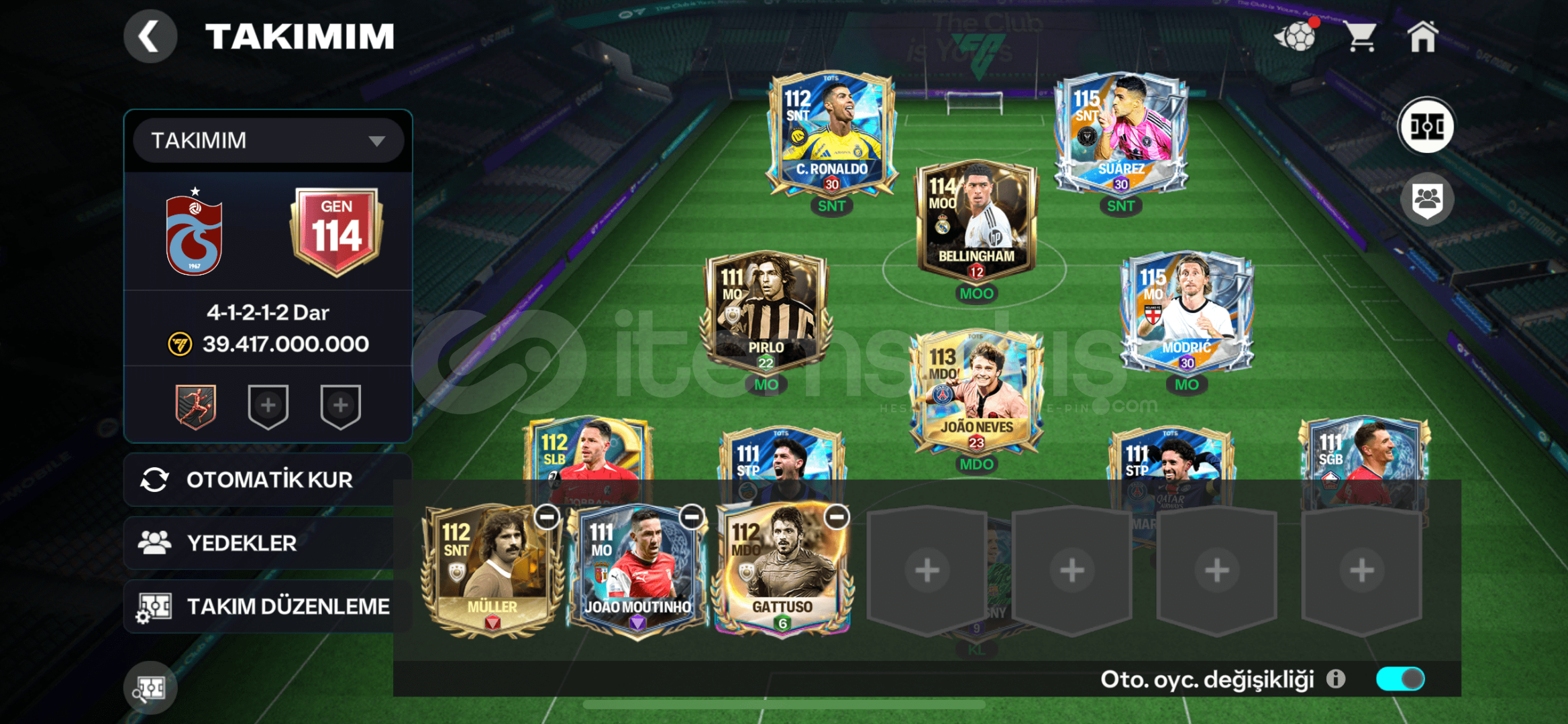 Hesapta anlık değeri 5 milyar olan 115 gen MODRİC VAR BUNUN DIŞINDA 112 GEN C.RONALDO,MÜLLER,SUAREZ vardır.BUNLARIN GÜNCEL PAZAR FİYATI 2 MİLYAR COİN VE ÜSTÜDÜR Satılabilir olan, 450MİLYON Bellingham VAR Hesap çok doludur güncel kadro değeri 40milyar coin 114 Gendir.