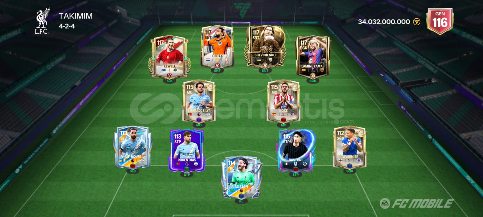 116 gen FC mobil hesabı fiyatı siz belirliyorsunuz 117 shevchenko 117 depay 117 yamal var hesapta uygun fiyat veriniz düzgün fiyat...