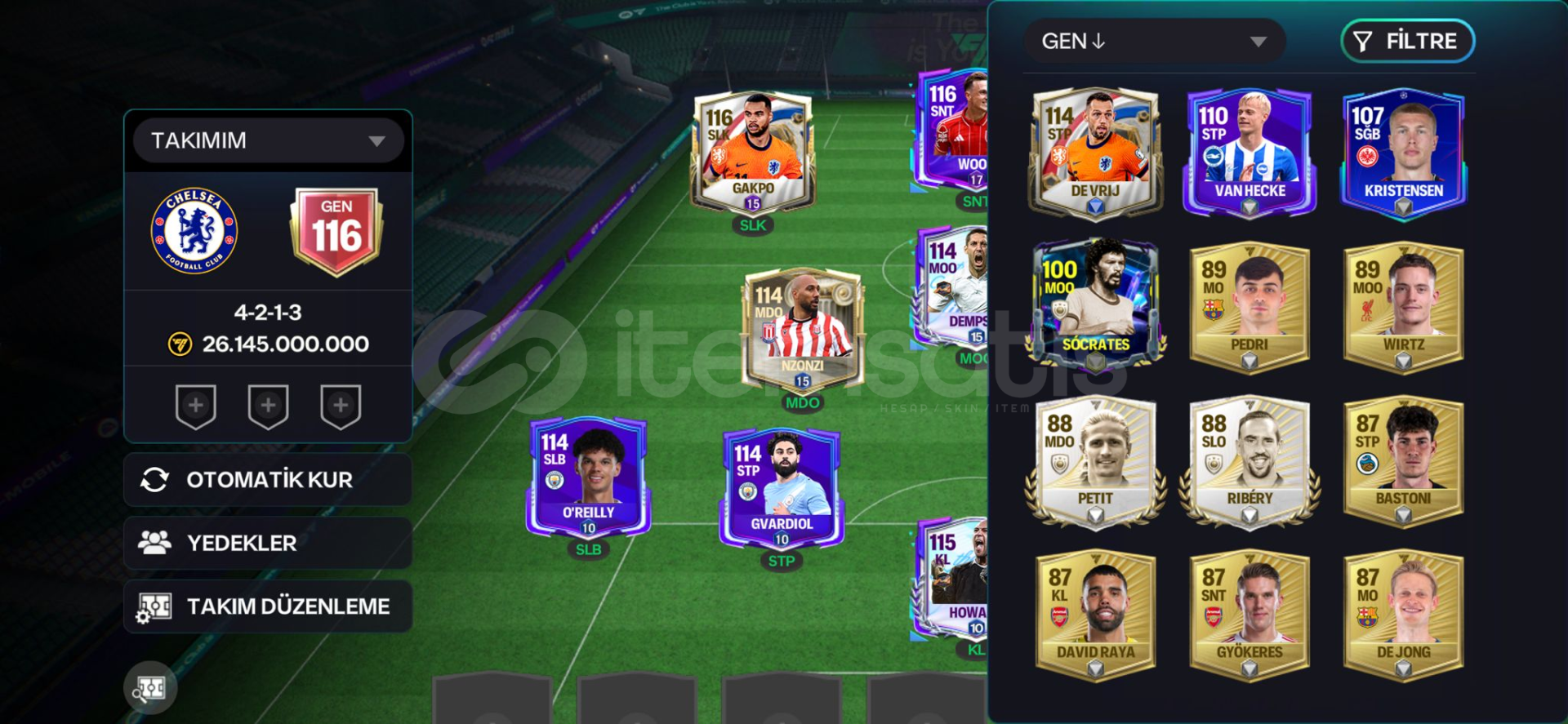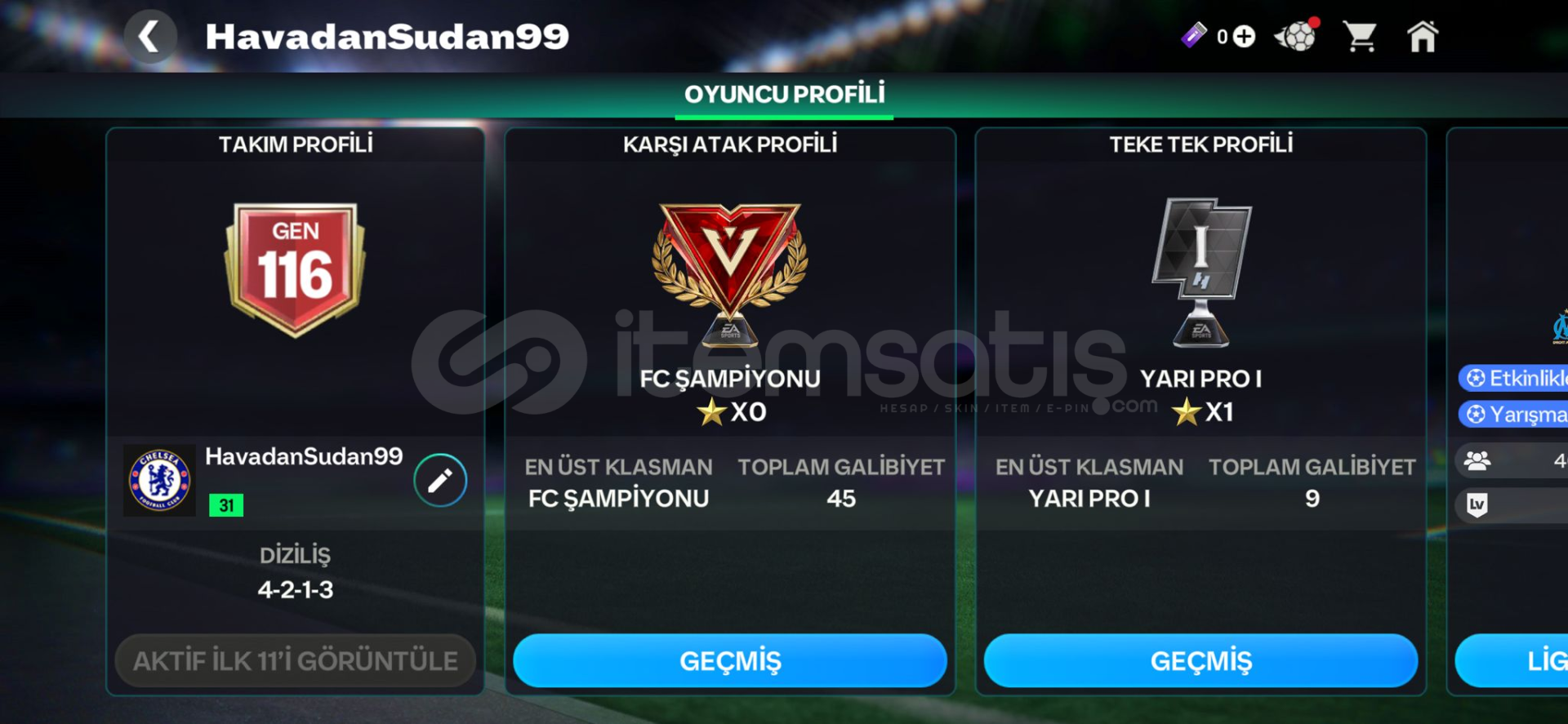 TEK BAĞ EA GAMES HESABI OLARAK VERİLECEK KİŞİSEL HESABIM OYUN OYNAMAYI BIRAKTIĞIM İÇİN SATIYORUM PAZARLIK VAR YAZIN.116 gen 117ye az var güncel ka ligi fc şampiyonu 31 lv193milyon para var satılabilir oyuncu yok oyuncular full değil bazıları 2 bazıları 3 kere basılmış.