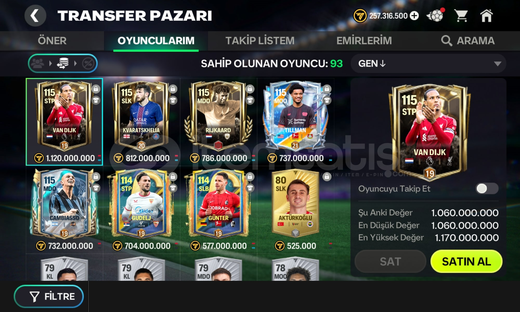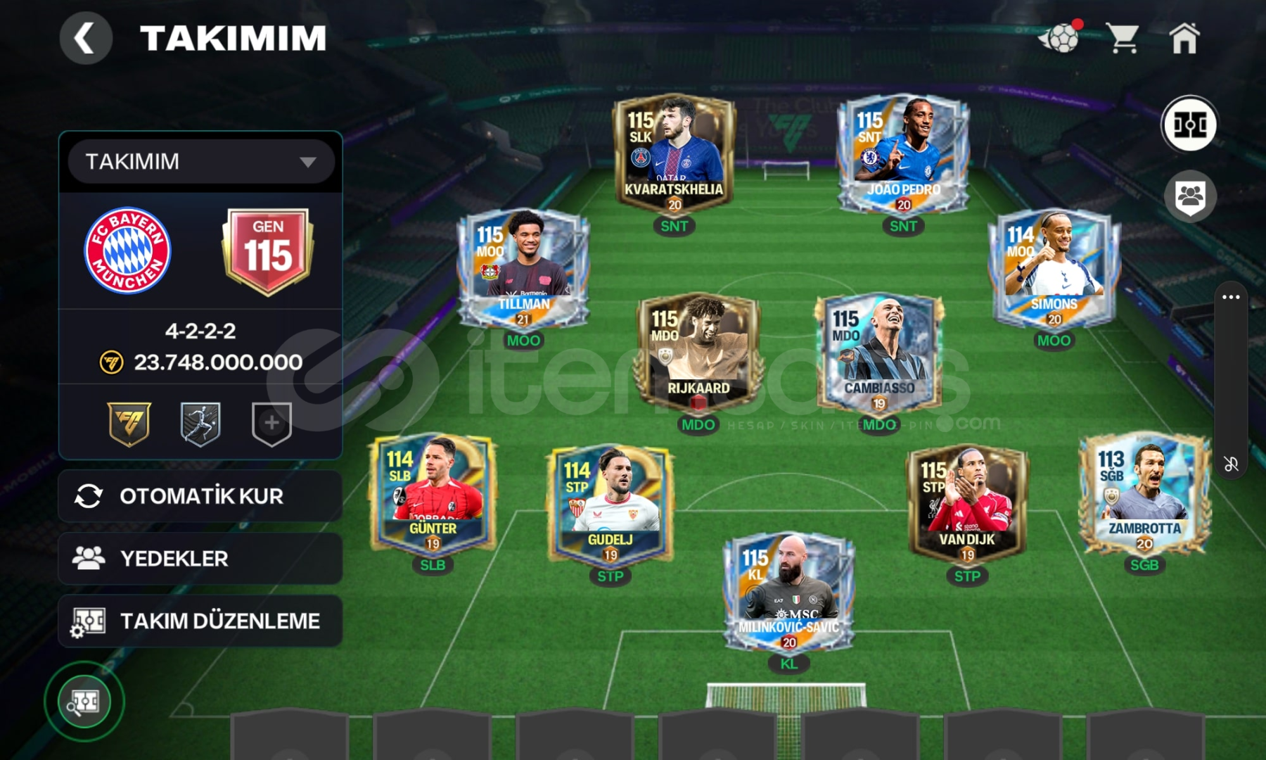 116 gen olmasına 2 yükseltme kalmıştır çoğu yer yapılmadı rahatça yükseltme puanı toplayabilirsiniz hesapta 250 milyon coinste bulunmaktadır karşı atak ve teknik direktörde fc şampiyonu olmuştur oyuncuların çoğu satılabilirdir hepsi pahalı iyi oyunculardır sadece ea ye bağlıdır maille teslim edilecektir