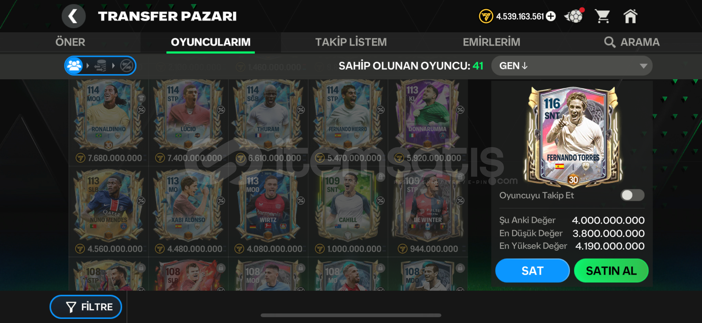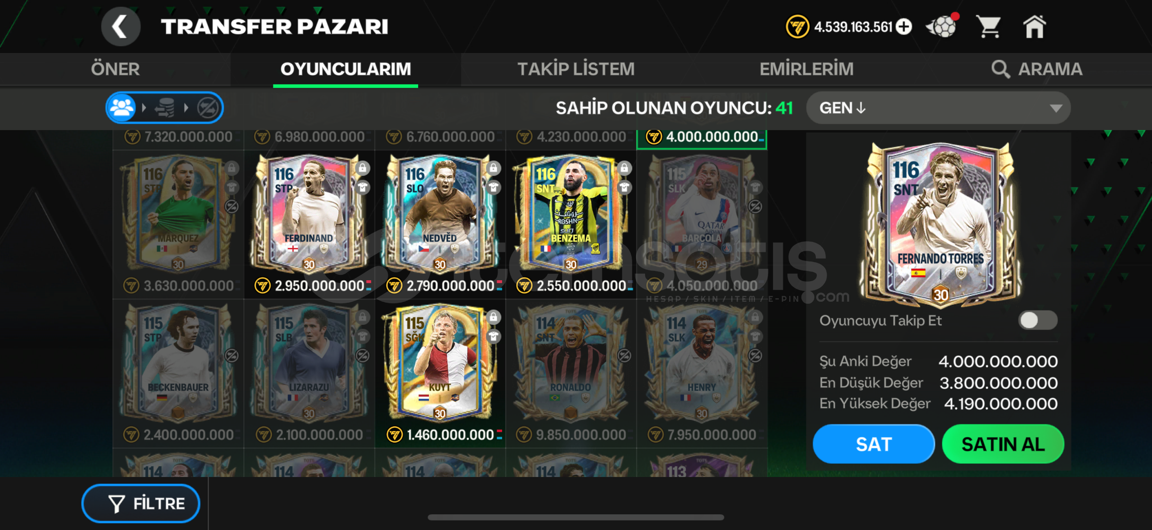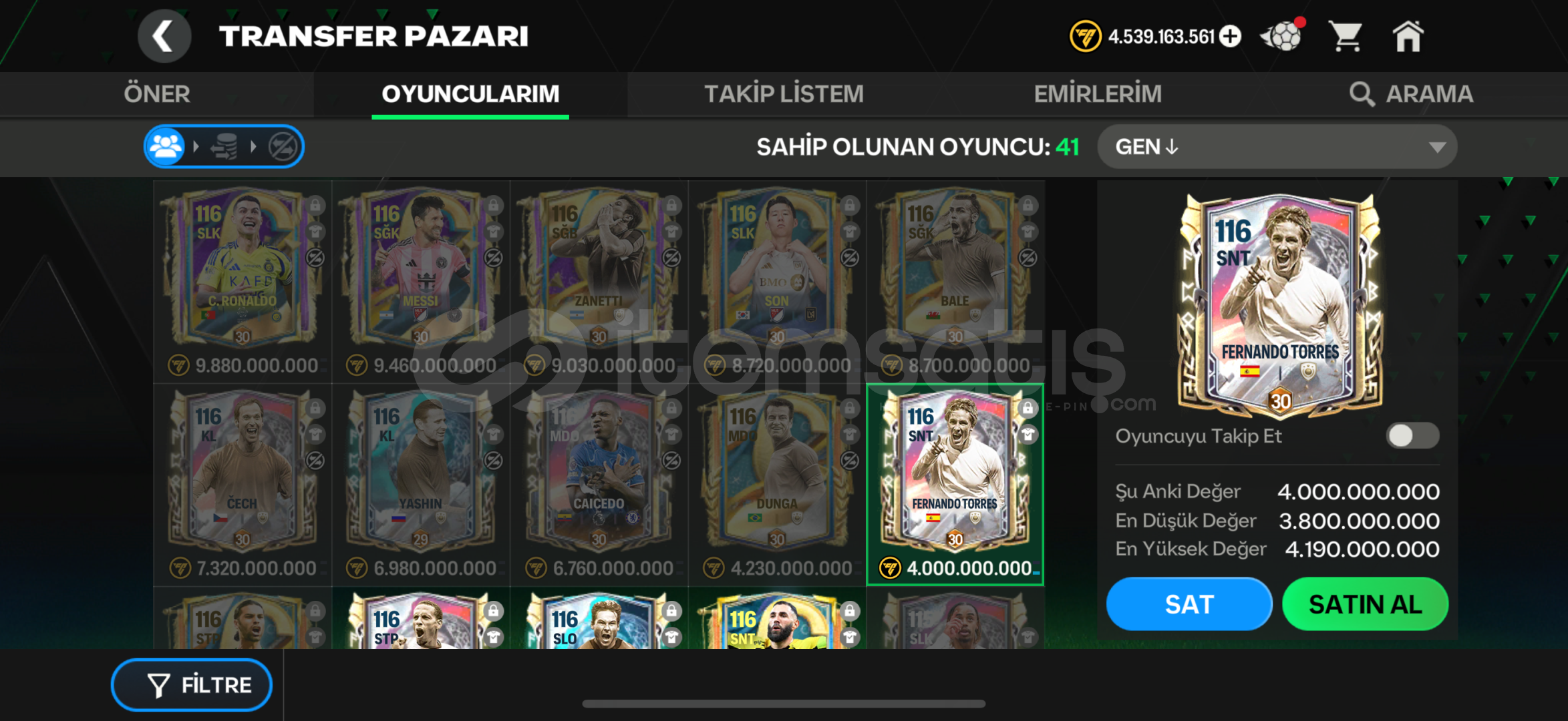 cümleten hayırlı günler 116 gen 116 gen yedek ve en iyi oyuncular ronaldo messi bale son dunga kalede en iyi ve pahalı 116 cech hesapta 6 tane satılabilir oyuncu var 116 gen olan 12 milyar o hesapta 4.5 milyar para toplam 16.5 milyar parayla zevkine göre almak istediğin her oyuncuyla yeni kadro yaparsın nerdeyse yani verilen emekler ve maddiyat çok üst düzey pese geçmek için satmayı düşünüyorum f...