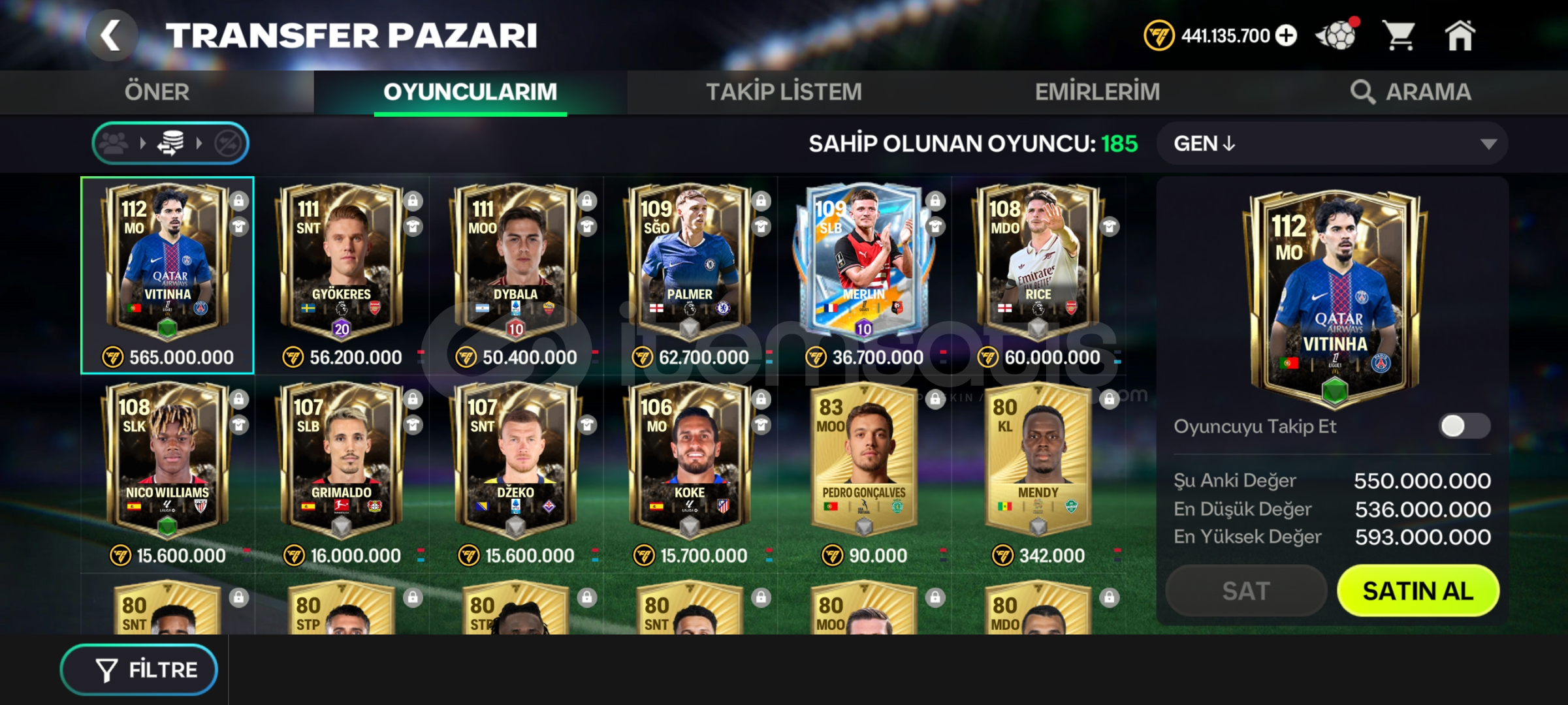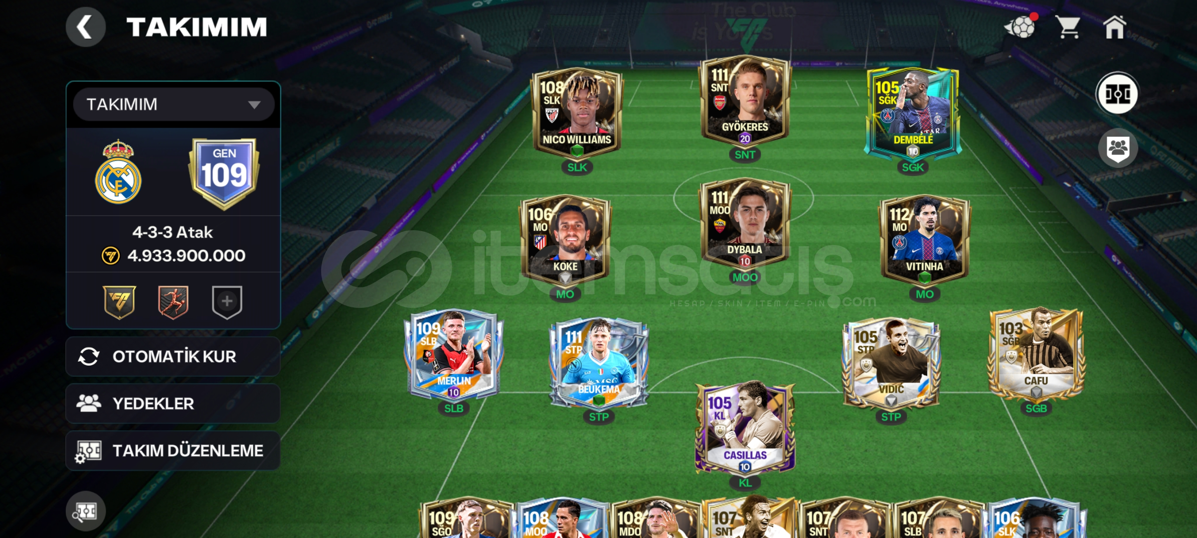 Hesap gördüğünüz gibidirÇoğu oyuncu basılmamıştırYedeklerle birlikte 109 genVitinha 111+1 basım yapılmıştır full basım 116 oluyorAlıcıya hayırlı olsunTek bağ EA