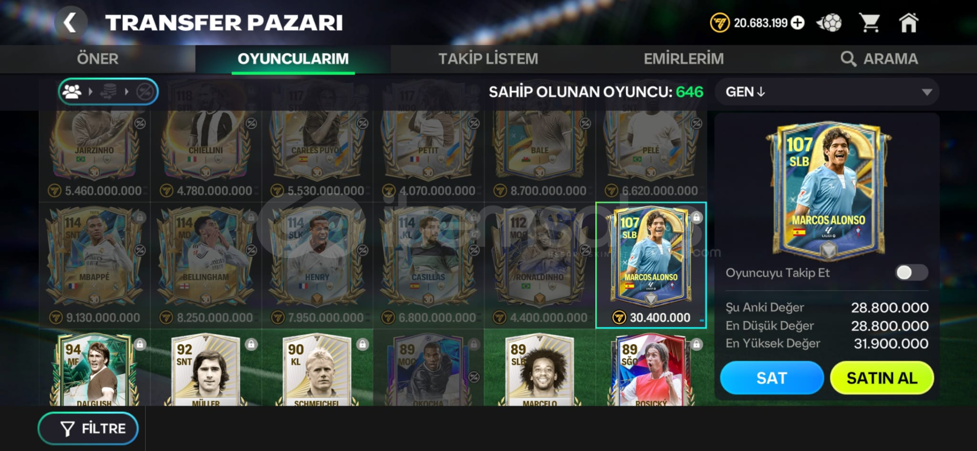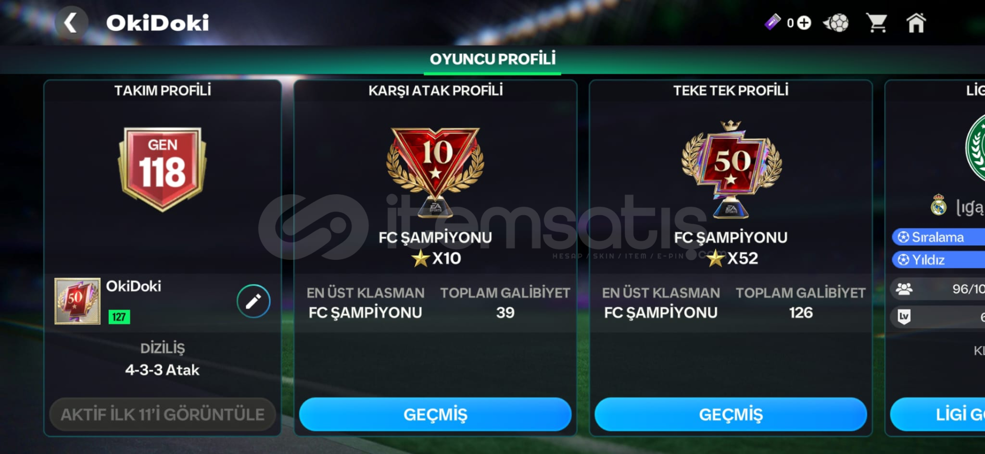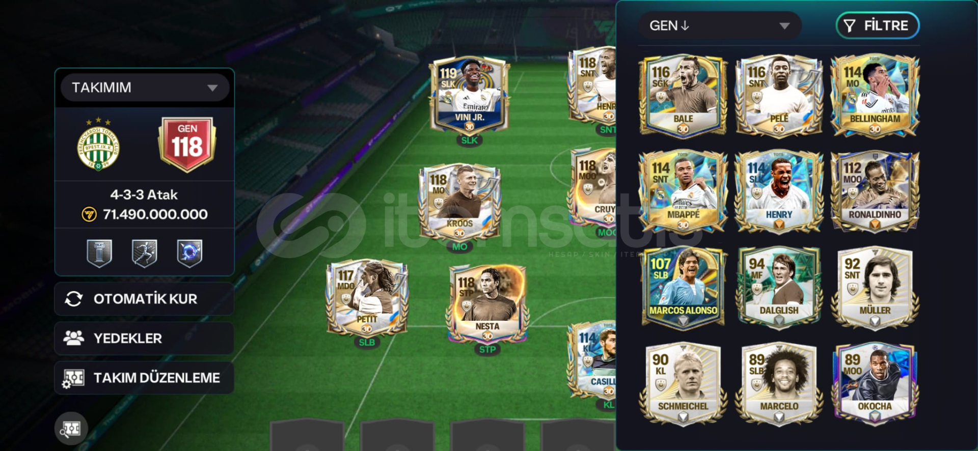 hesap 127 lvl 118 GN kadrodaki oyuncular ise 119 vini 118 henry 117 jairzinho 118 kroos 118 cruyff 120 beckham 117 petit 118 nesta 118 chiellini 117 puyol ve 114 casillasyedekler ise 116 bale 114 mbappe 114 bellingham 116 pele gibi yıldız isimler yer almaktadır. Hesap google play hesabına bağlıdır ve o şekilde teslim edilecektir.