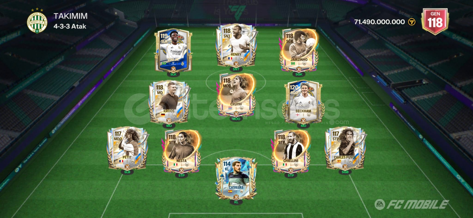 hesap 127 lvl 118 GN kadrodaki oyuncular ise 119 vini 118 henry 117 jairzinho 118 kroos 118 cruyff 120 beckham 117 petit 118 nesta 118 chiellini 117 puyol ve 114 casillas