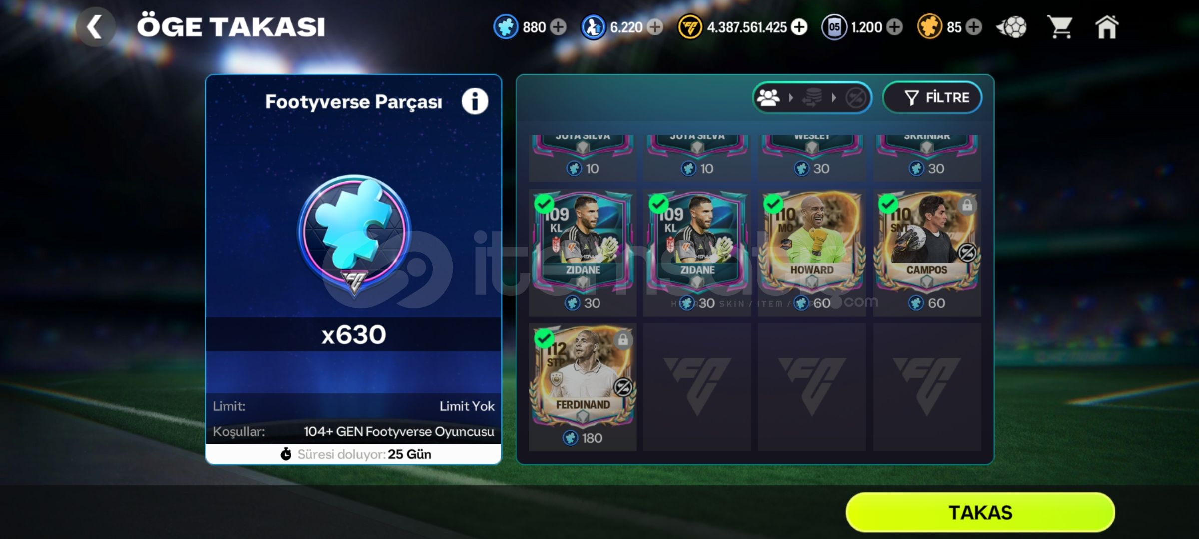 Hesaptan aktif 4.3 mr mevcut. Dembele beckenbauer ve rivaldo satilabilir durumda hepsini satınca 10_12 mr yapar. Etkinlikte su anda bi oyuncu alınabilir 1500 parça mevcut.6000 küsür oyuncu geliştirme puani mevcut.