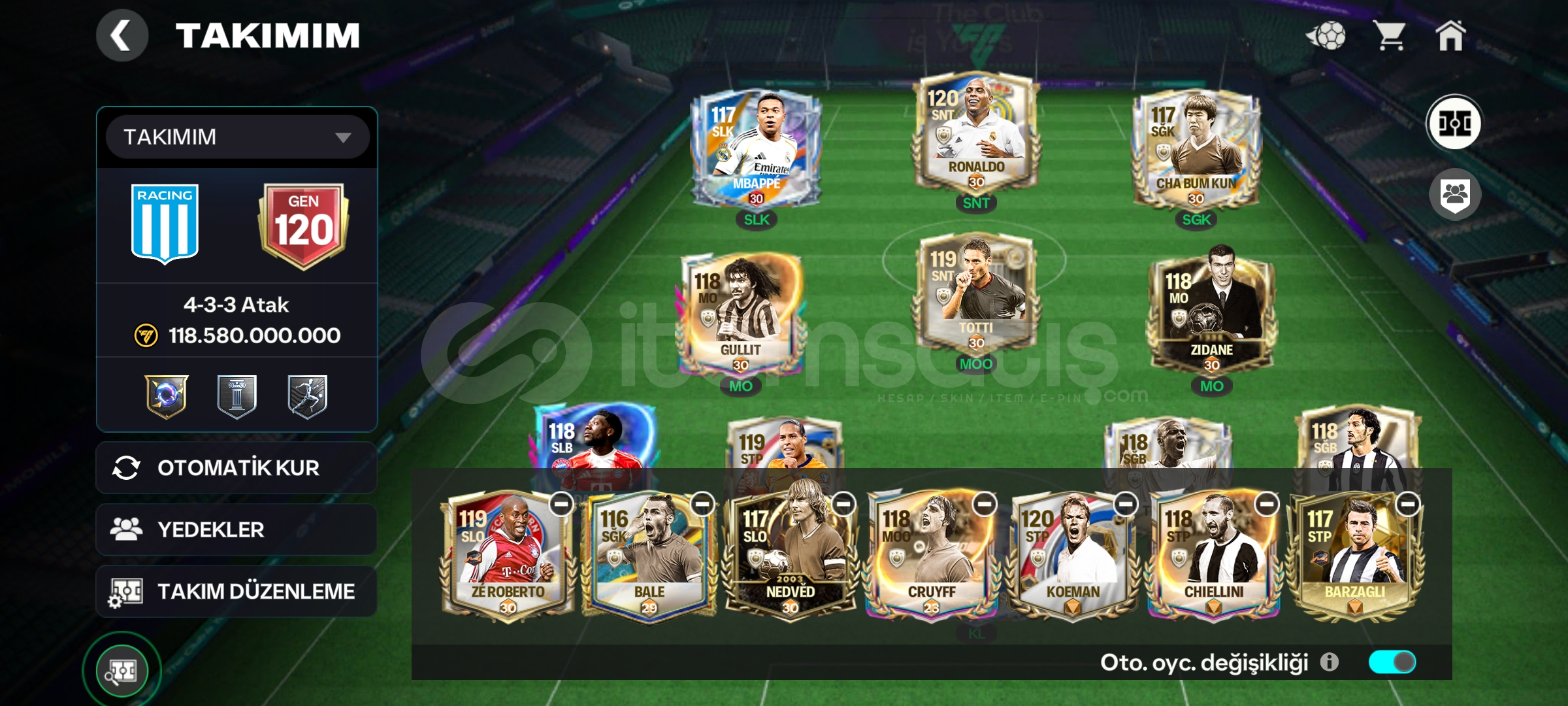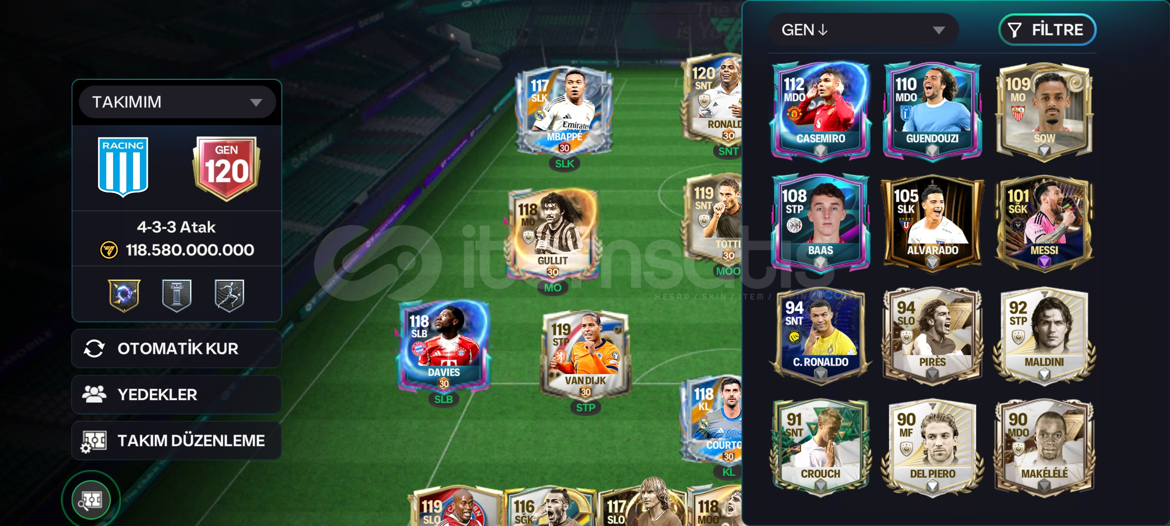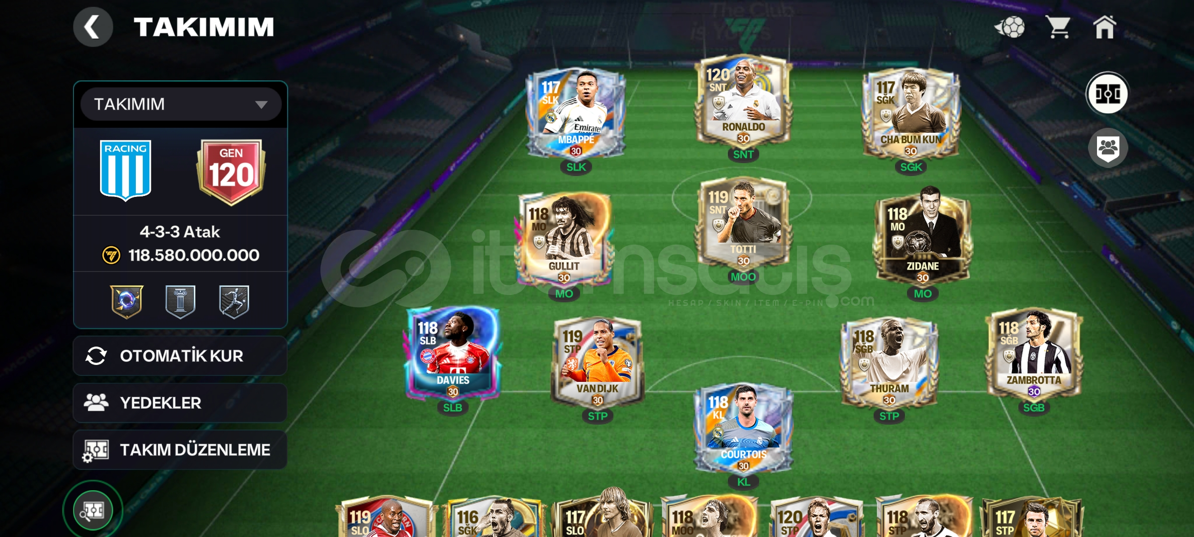 Hesap 120 gendir.120 Ronaldo120 koeman120 zambrotta119 ze roberto119 Van dijk ve bunun haricinde oyunun en iyi oyuncuları mevcuttur.Yedek slotu doludur.Lig sahibi hesaptır.Bu hafta Perşembe günü 71 bin lig puanı gelecek hazırda 14 bin puan vardır.Satılırla beraber 2 m coins vardır.Ayrıca division da karşı atak ve menajer de 10 yıldızdır. Al owairan alındı.