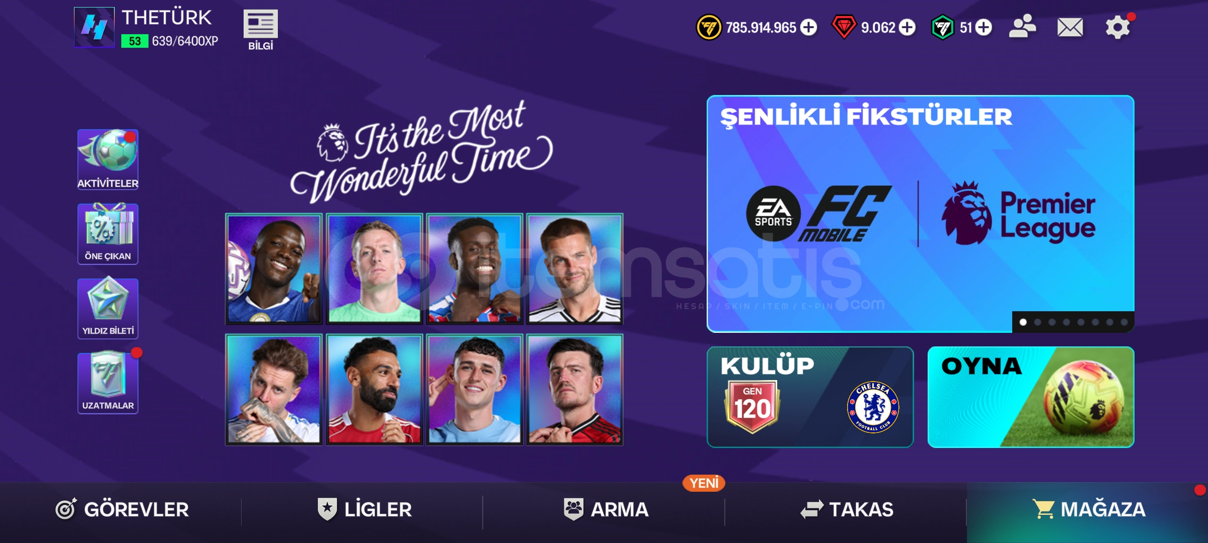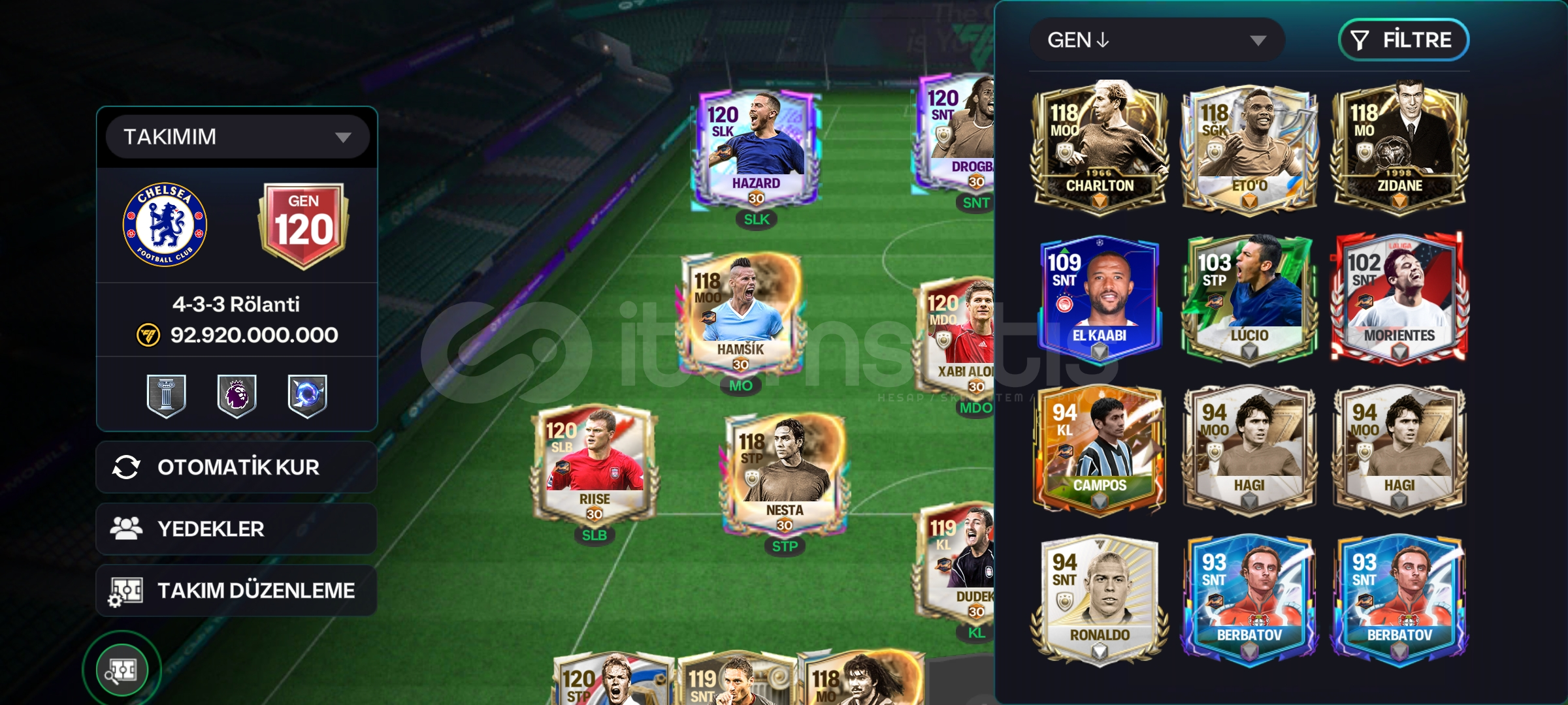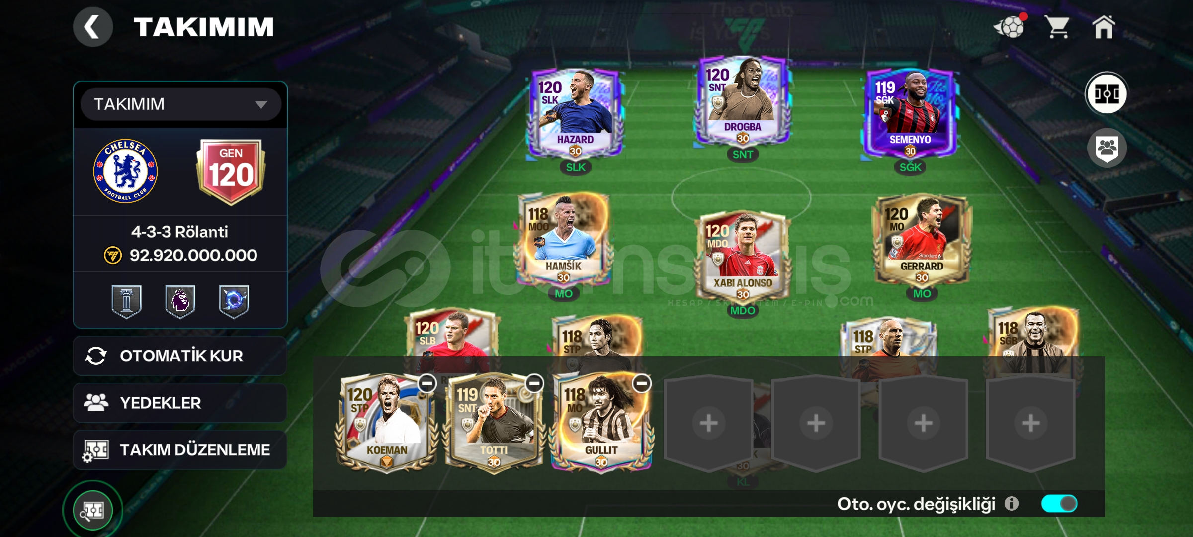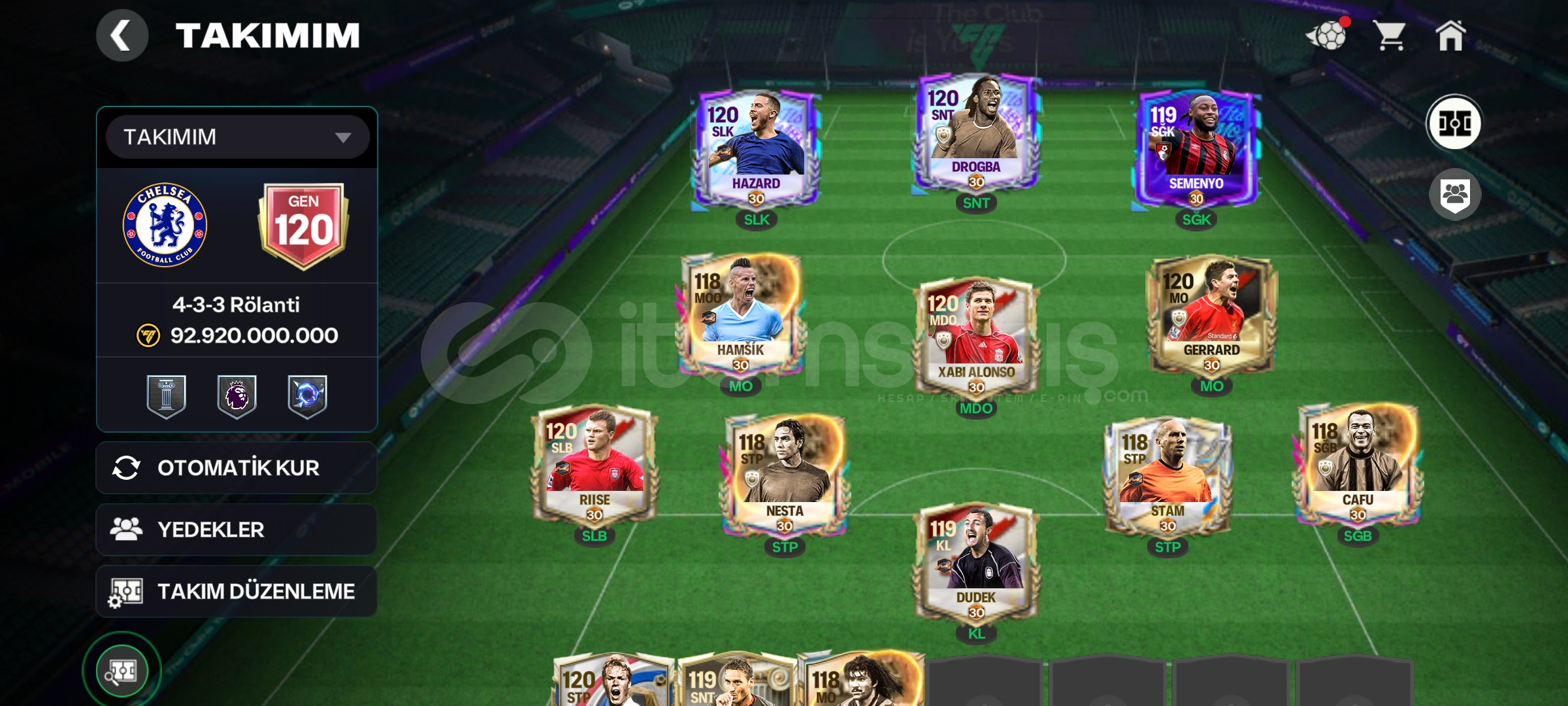 Hesapta 800 m coins 9000 cevher mevcut300 derece fişi var ileri hattı120 hazard 120 Drogba 119 semenyoİmzalı gerard var hesapta onun dışında 6 tane 120 gen oyuncu mevcut.Alıcısına hayırlı olsun.