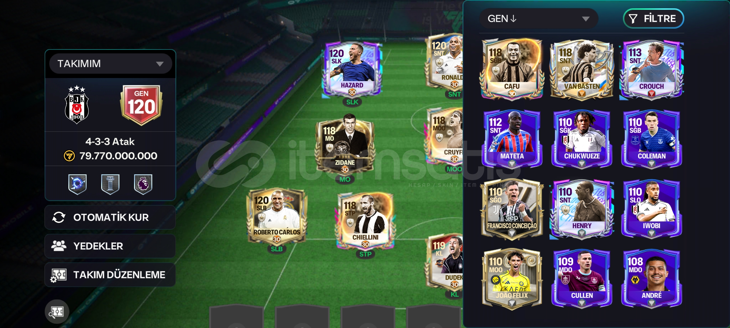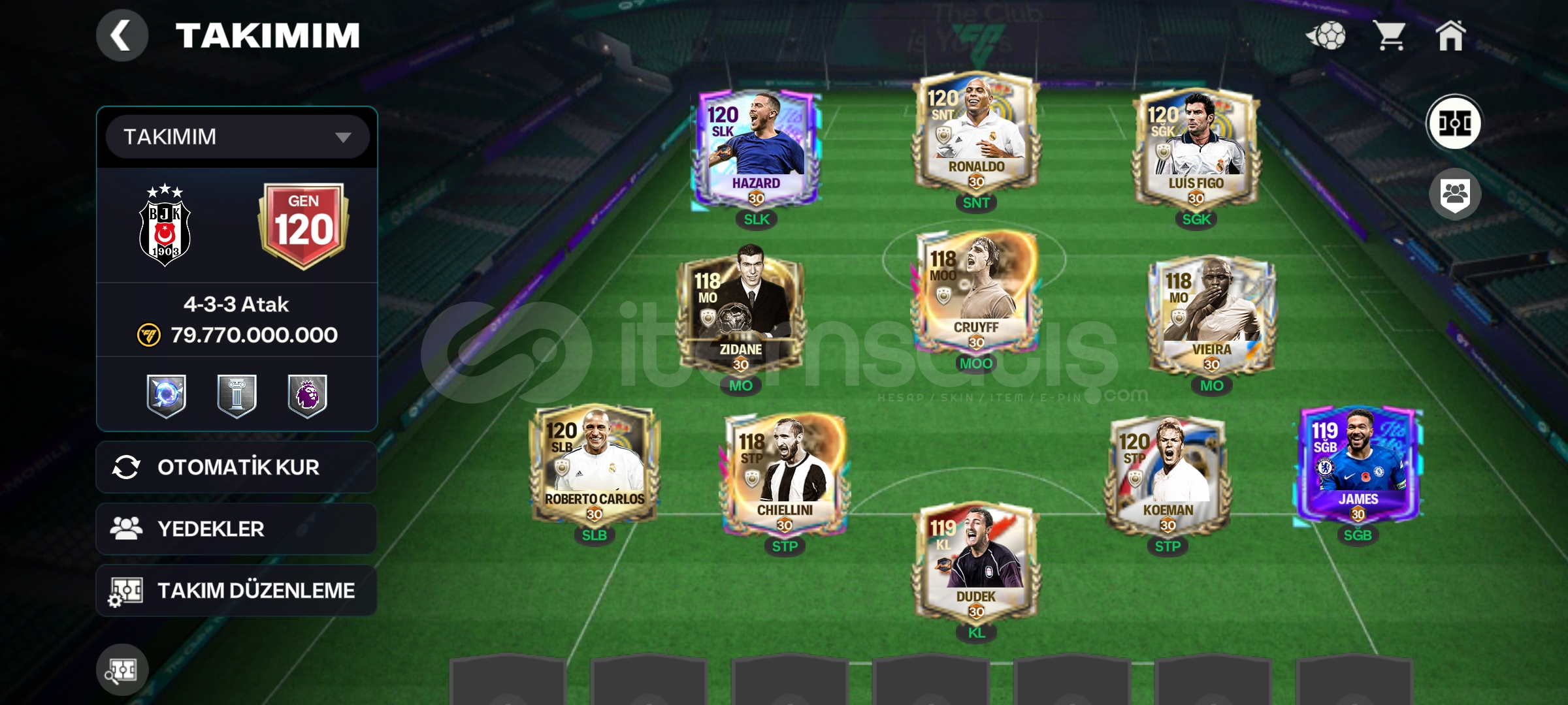 Takım full. 120 gen. Oyuncular Süper. İki arma yukseltimi ile 122 gen oluyor direk. Yazdigim fiyat bir oyuncu parası değil. P...