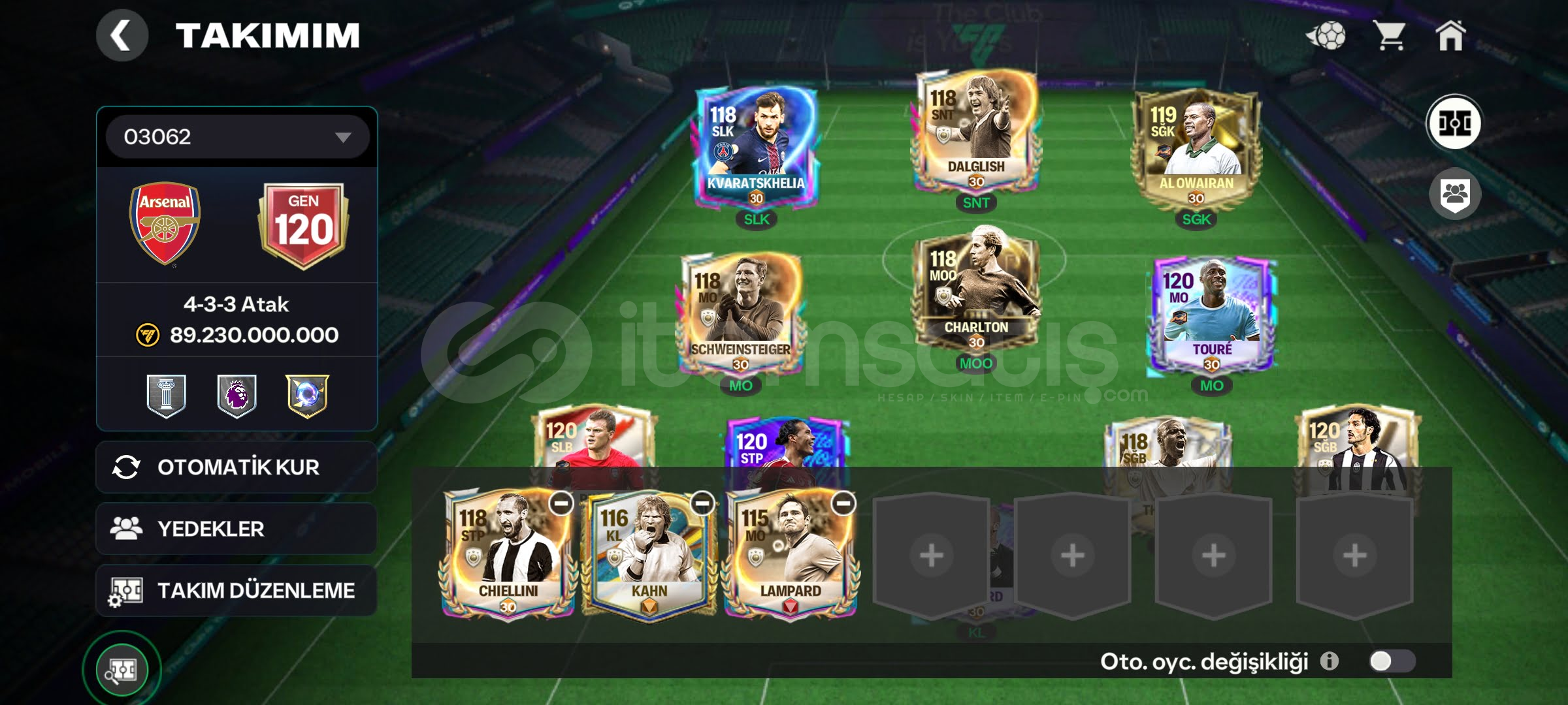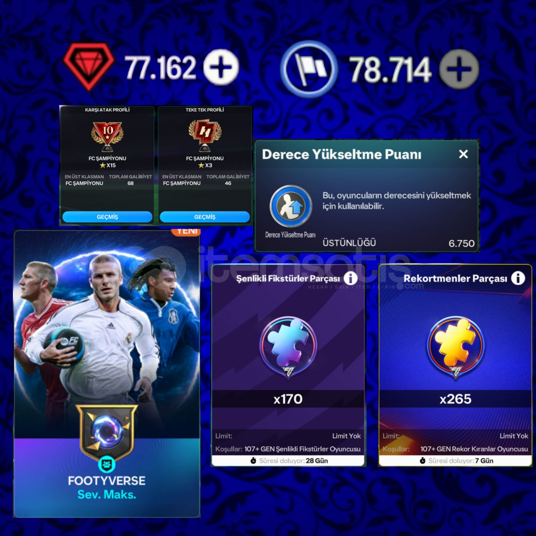 🔥 BU HESAP KAÇMAZ 🔥GEN: 120 🧬 Arma 3 Sv +1 GenDivision Rivals 🆚️Karşı atak FC ŞAMPİYONU 🏆Teke tek FC ŞAMPİYONU 🏆T.Direktör FC ŞAMPİYONU 🏆Öne Çıkanlar: Van Dijk 120, Toure 120, Zambrotta 120, Riise 120, Al Owairan 119,Howard 118, Dalglish 118, Kvaratskhelia 118, Thuram 118, Charlton 118, Schweinsteiger 118, Chiellini 118, Kahn, Lampard 1166750 Derece Fişi (ald&#...