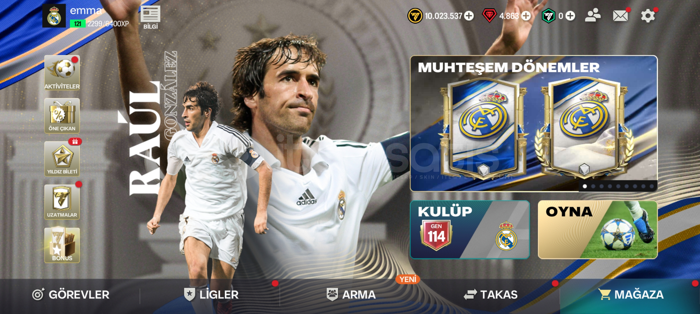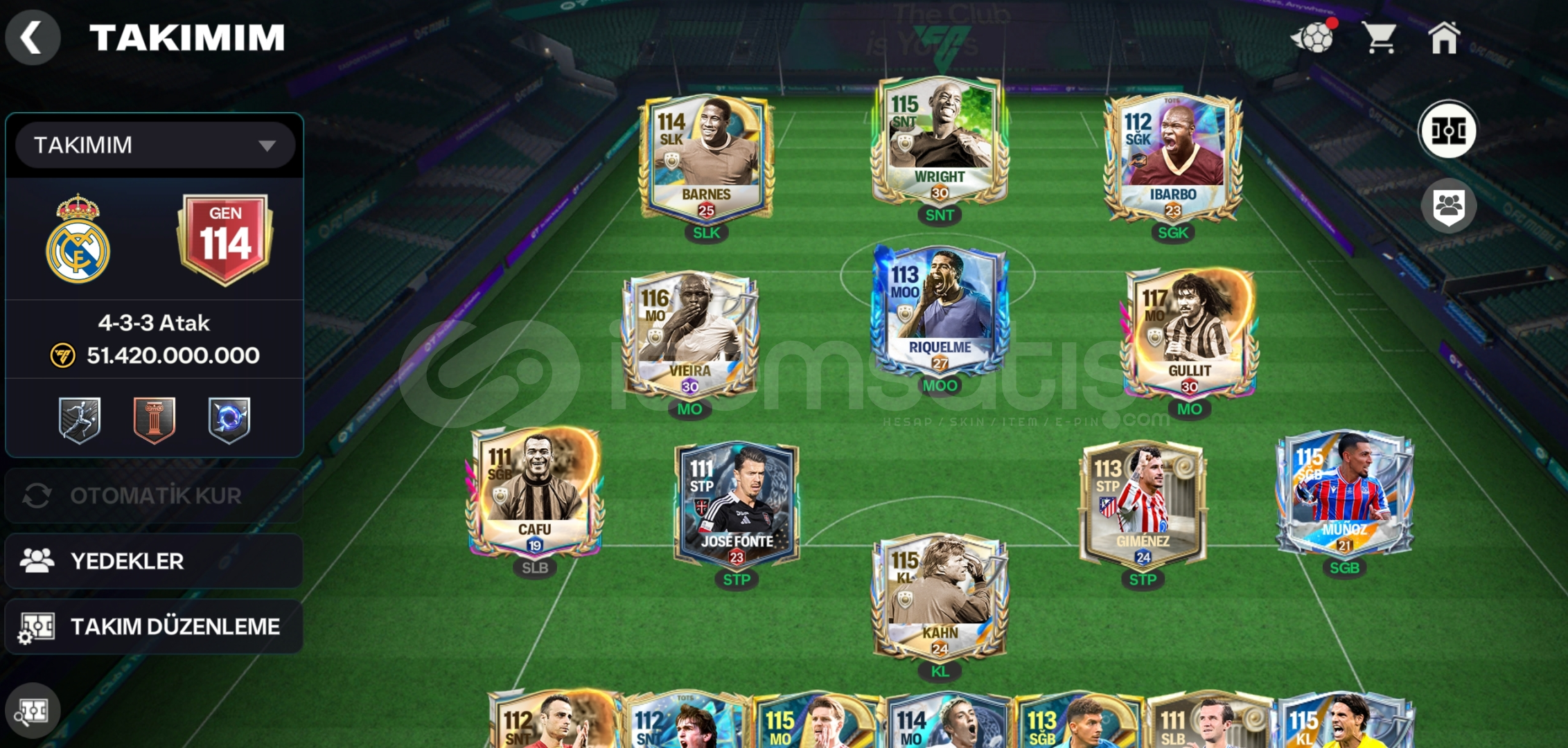 ⚽ FC Mobile Hesap Satılık – GEN 114 HesapTakım GEN: 114Diziliş: 4-3-3 AtakKadro değeri: 51.420.000.000Birçok özel kart, ikon ve efsane oyuncu mevcutÖne çıkan oyuncular:Vieira 116, Gullit 117, Wright 115, Barnes 114, Riquelme 113Defans hattı güçlü: Cafu, Gimenez, Muñoz, Kahn, José FonteKulüp seviyesi: 121Hesapta fotoğraftaki miktarda altın ve elmas (ekranda göründü&#...