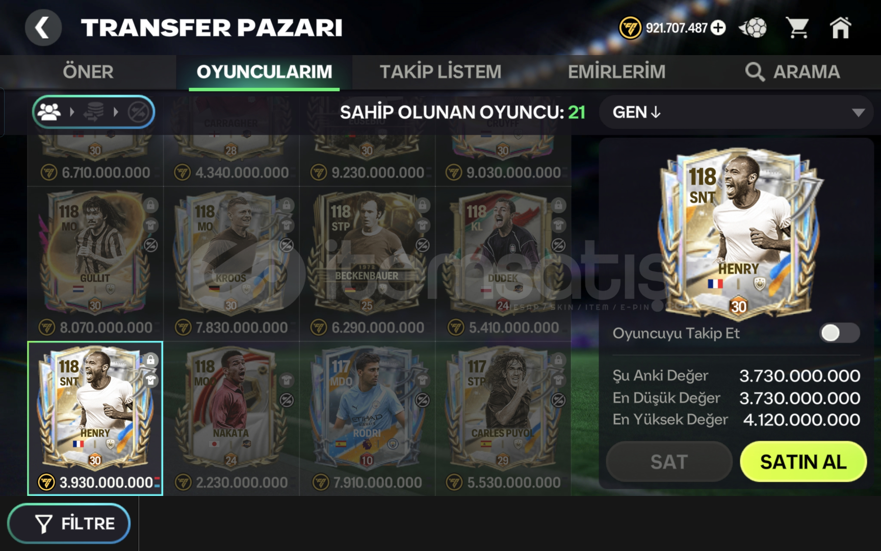 Hesabımda tüm etkinliklere katılım sağladı çok rahat sekilde 121 gen olabiliyor defansta puyol yerine 118 gen koyuldugu an 121 gen ayrica aktif olarak 2 adet 119 2 adet 120 gen oyunun en pahalı oyunculari var 4500 milyonluk henry satılabilir durumda yeni sezon olmasina ragmen 3 klasmandada şampiyon , hesaba 50 60 bin harcandı kadro en ince detayına kadar bilinçli yapıldı yeni arma seviye 3 olmak üzere oyunda aktif 3 seviye yok zaten 1300 parça mevcut yani 1 adet daha en az suan bile 120 gen alınabilir durumda , istedigin saatte tüm e posta vs islemlerini devirini güvenli şekilde teslim edip epostaniza tasiyabilecegimiz tek bağlı muhtesem bi hesap acil iş durumumdan dolayı satıyorum ufak bi pazarlık yapılır ciddi alıcıya. 119 totti st açık Yıldız bileti premium.