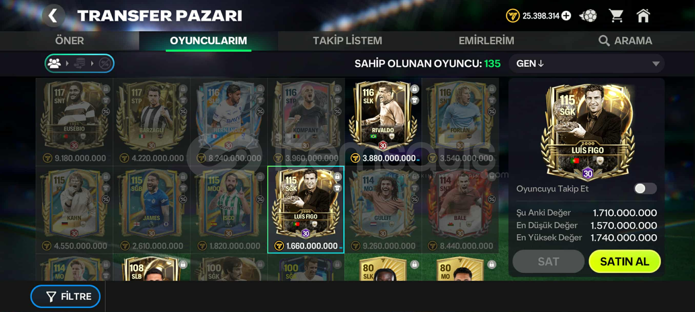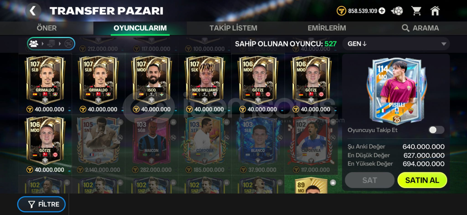 117Gen Maks Derece. 2 satılır oyuncu mevcut. Yildiz bileti alındı ve bitirildi. Etkinlikte 1300 puan var. Oyuncu alınıp ister coins katlanır ister oynanılıp gen 118 yapılır. Ligi turkiyede 1.bitiren lig. Tek bağ. Eksiksiz full hesaptir. Almadan once lutfen iletisime geciniz.