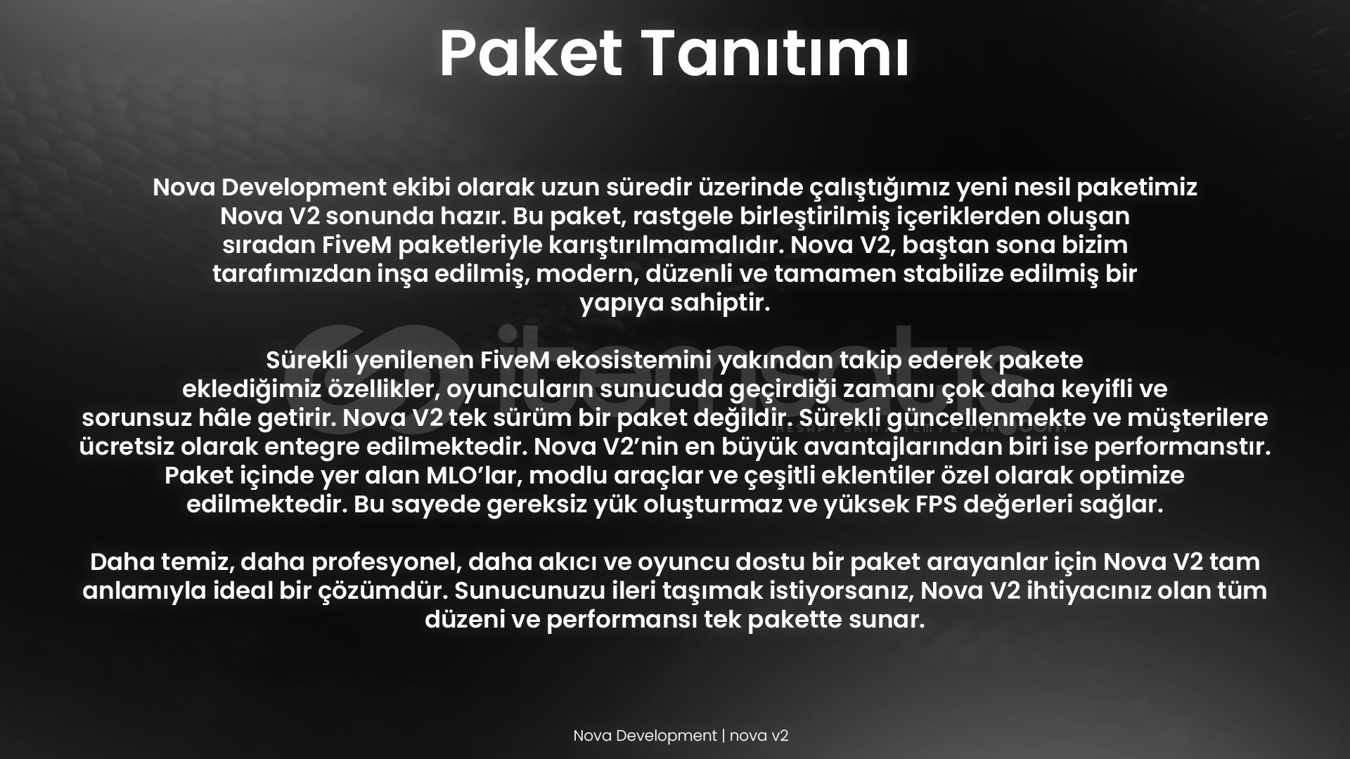 Bu nedenle Nova V2, tek seferlik bir ürün değil; sürekli geliştirilen ve güncellenen bir FiveM paketidir.