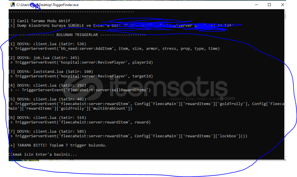 TriggerFinder - Profesyonel Sunucu TarayıcıSunucu paketini veya dump klasörünü loader'ın içine atın, sunucudaki tüm açıkları (para, item, araç basma vb.) anında bulun!✅ Otomatik Ayıklama: Binlerce çöp kodun arasından sadece çalışan exploitleri seçer. ✅ Hazır Kod Teslimi: Bulduğu açıkları direkt kullanıma hazır kod bloğu ol...