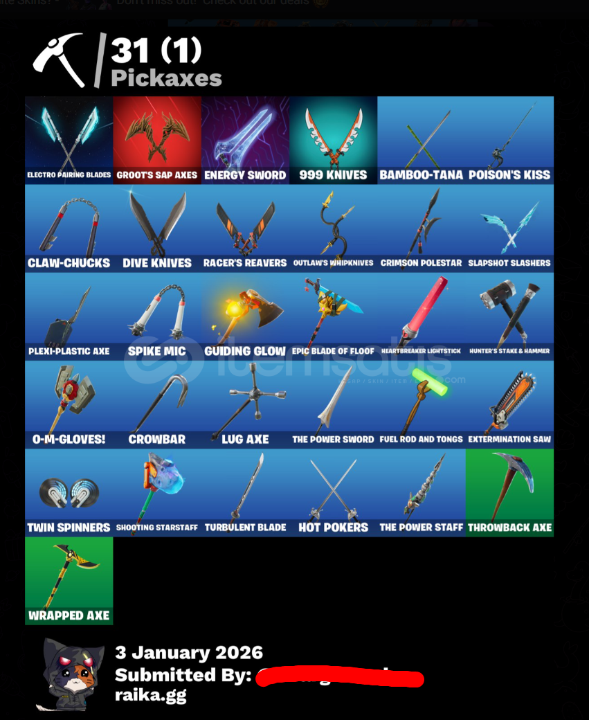[PC] 21 skins | UNSC Spartan | SAVAŞÇI JUICE WRLD | Russel | Lamabot 3000 | Gelin | Hana Park | Hiçlik Gezgini Karakulak | ATEŞ USTASI KAI | 16600 VBHESAPTA 16600 VBUCKS BULUNMAKTADIR. 3 TANE İADE BİLETİ MEVCUTTUREPİC HESABINDA EKSTRA OYUNLAR ÇIKABİLİR.MAİLE BAĞLI 60 SEVİYE PUBG MOBİLE HESABIDA VARDIR. Hesap Seviyesi: 453 Toplam Galibiyet: 27 Toplam Maç: 3689 Rocket League 28 h. 34 min. GTA V 301 h. 34 min. (...