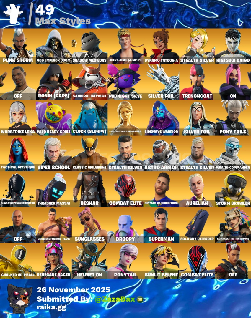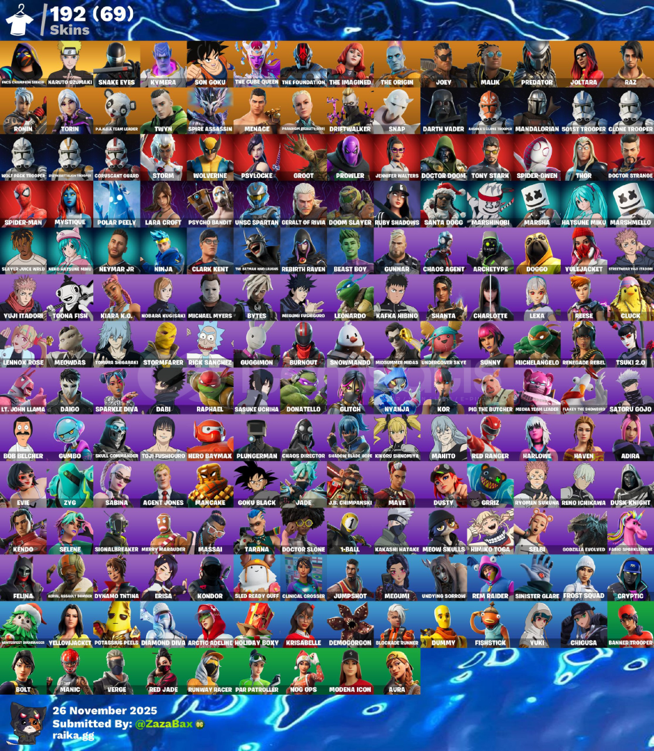 Hesapda olanlar 192 skins | FNCS Champion Seeker | Naruto Uzumaki | Snake Eyes | Kymera | Son Goku | The Cube Queen | The Foundation | The Imagined | Lara croft gold version gibi desenler vardir fotograftan bakabilirsiniz.