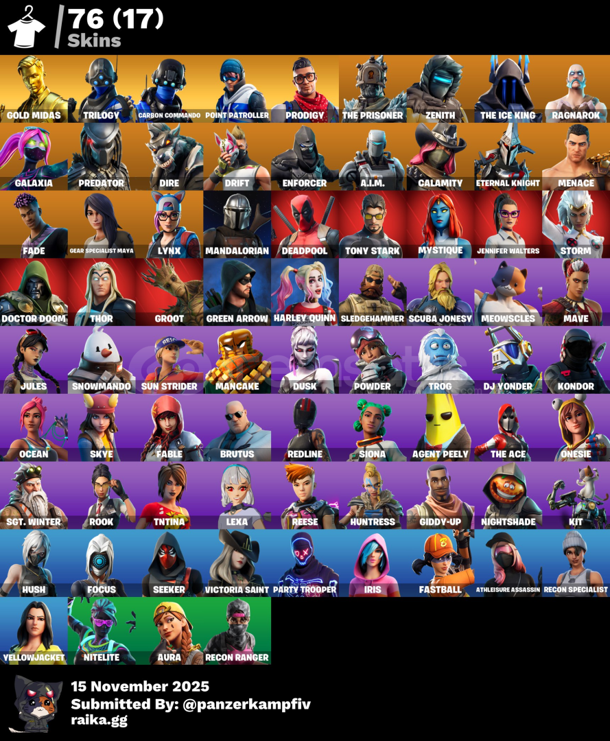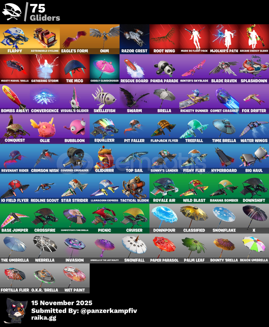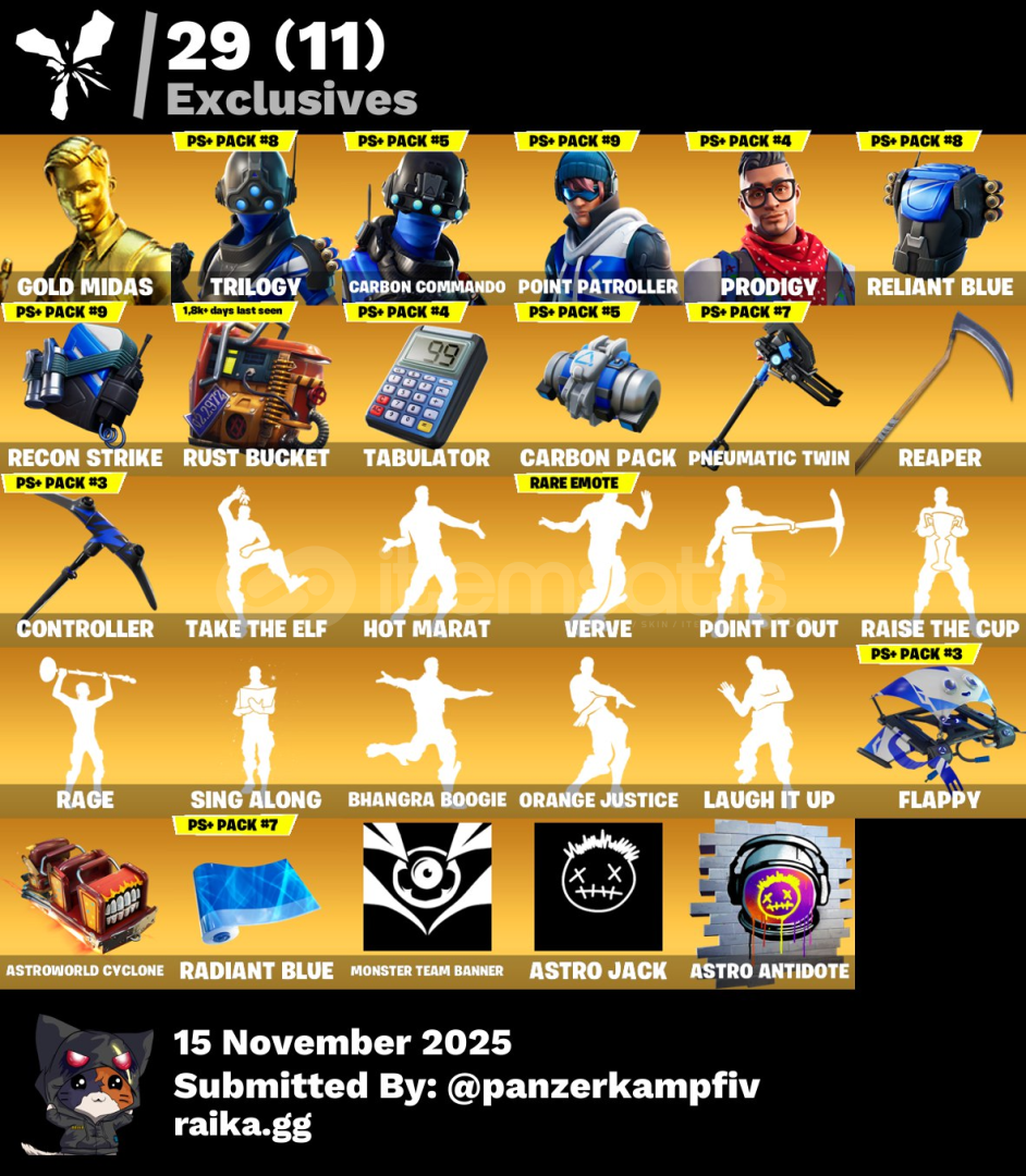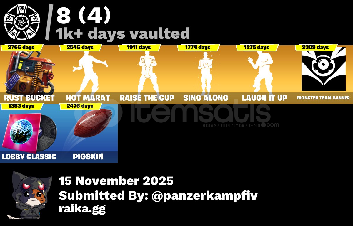 Hesapta 76 Skin, 102 Sırt Süsü, 78 Kazma, 94 Dans, 75 Planör bulunmaktadır.