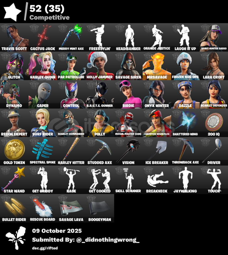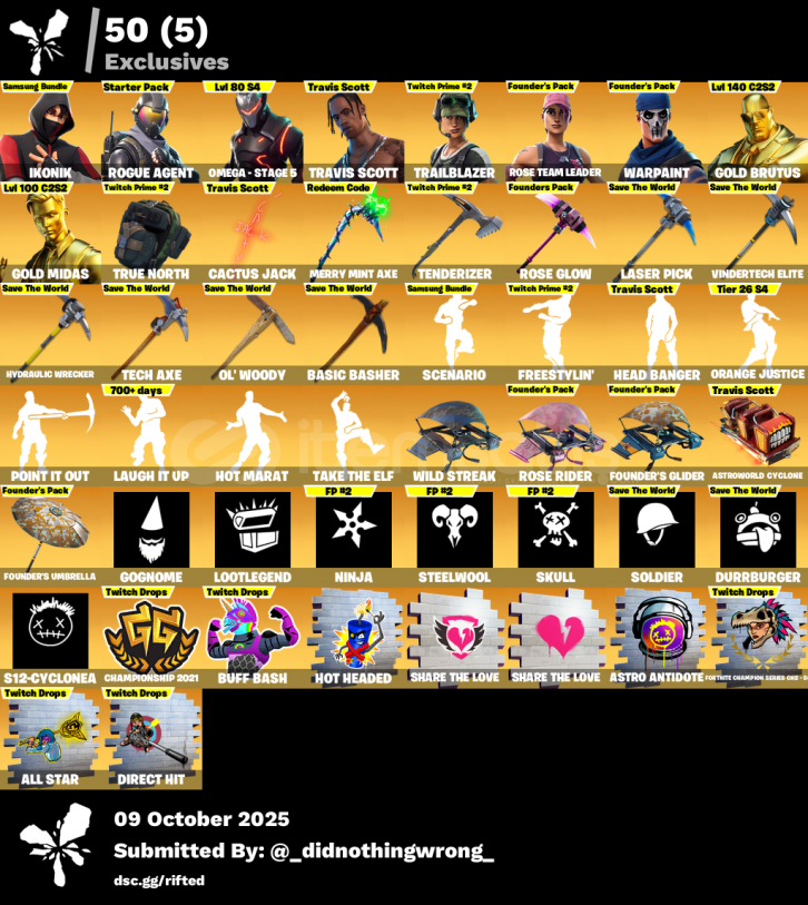 Hesapta birçok yeni gelen bundle alınmıştır. Mrsavage + ayakkabı, leatherface bundle, ash williams bundle, TRON bundle, iyi geceler tatlı rüyalar bundle, Glitch gibi tryhard skinler alınmıştır. Tüm skinlere detaylı bakınız. OG stw de mevcuttur. Hesapta 5000 v-papel vardır!