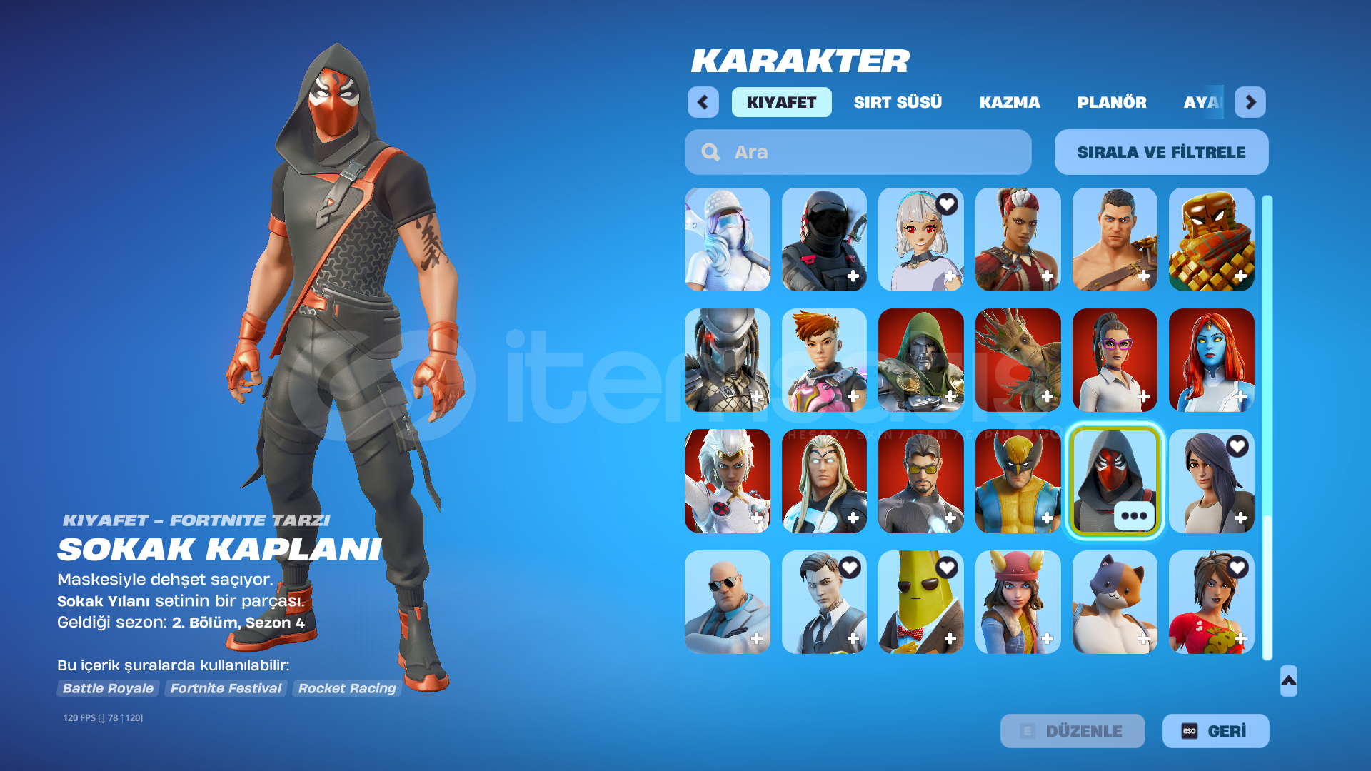 (SİREN,MİDASIN BATTLE PASSİ,KAYRA PAKETİ,PUNK GÜZELİ,KIZILCA PAKETİ,PİJAMALI ASKER,DENİZALTI PİLOTU,SOĞUK İDDİALI İBLİS,ELMAS AVCISI PAKETİ,SOKAK KAPLANI PAKETİ,TONY STARK BATTLE PASS'İ) HESAPTA ÇOĞUNLUKLA BATTLE PASS VARDIR