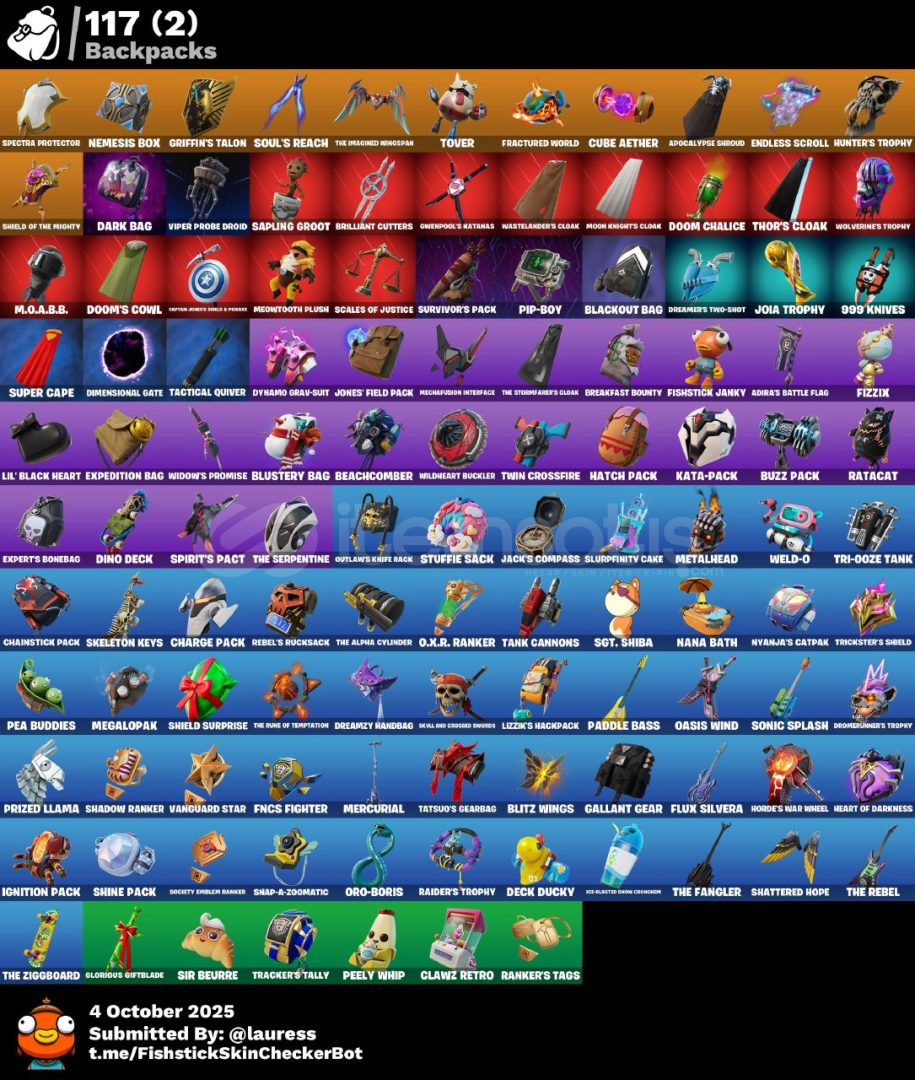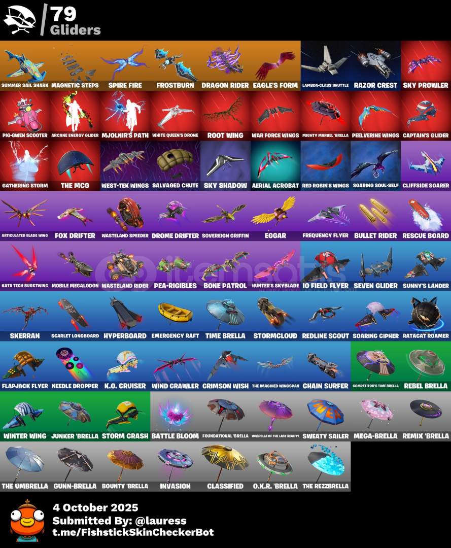 Kıyafetler: 84Sırt Çantaları: 117Kazmalar: 110Danslar: 55Planörler: 79Kaplamalar: 67Afişler: 83Spreyler: 99Özel Öğeler: 5