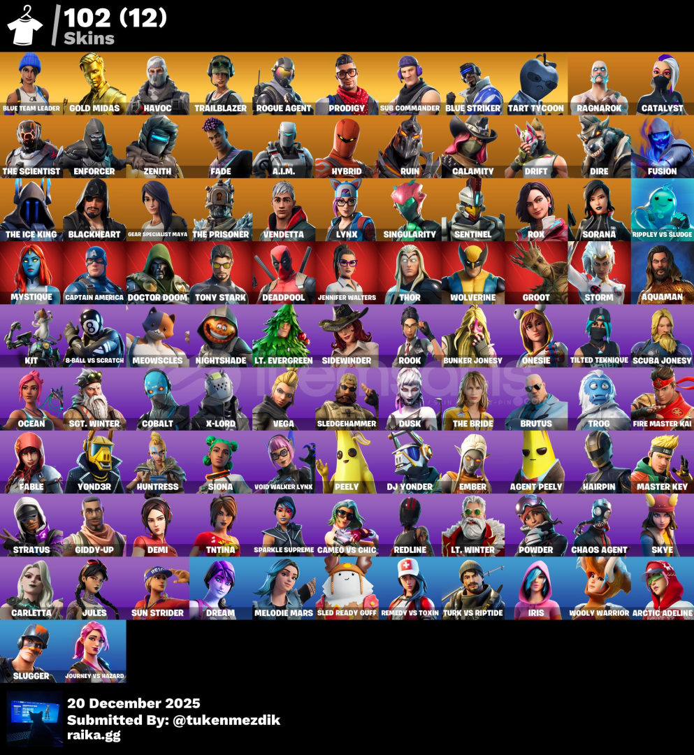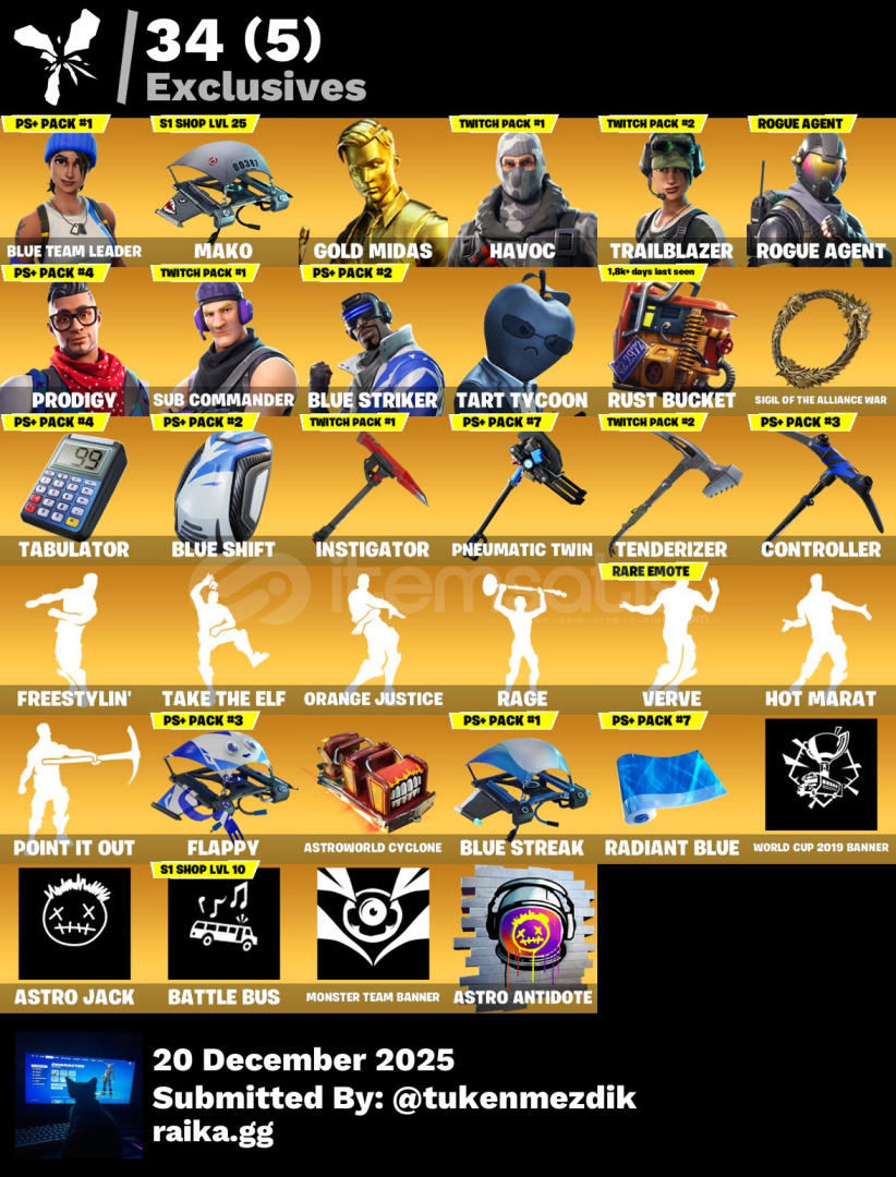hesapta chapter 1 sezon 5'den chapter 2 sezon 4'e kadar battle pass açıktır hesapta eski og ps pack skınlerı ve twıtch prime skınılerı bulunmaktadır ve hesapta 2k papel vardır alana iyi oyunlar dileriz