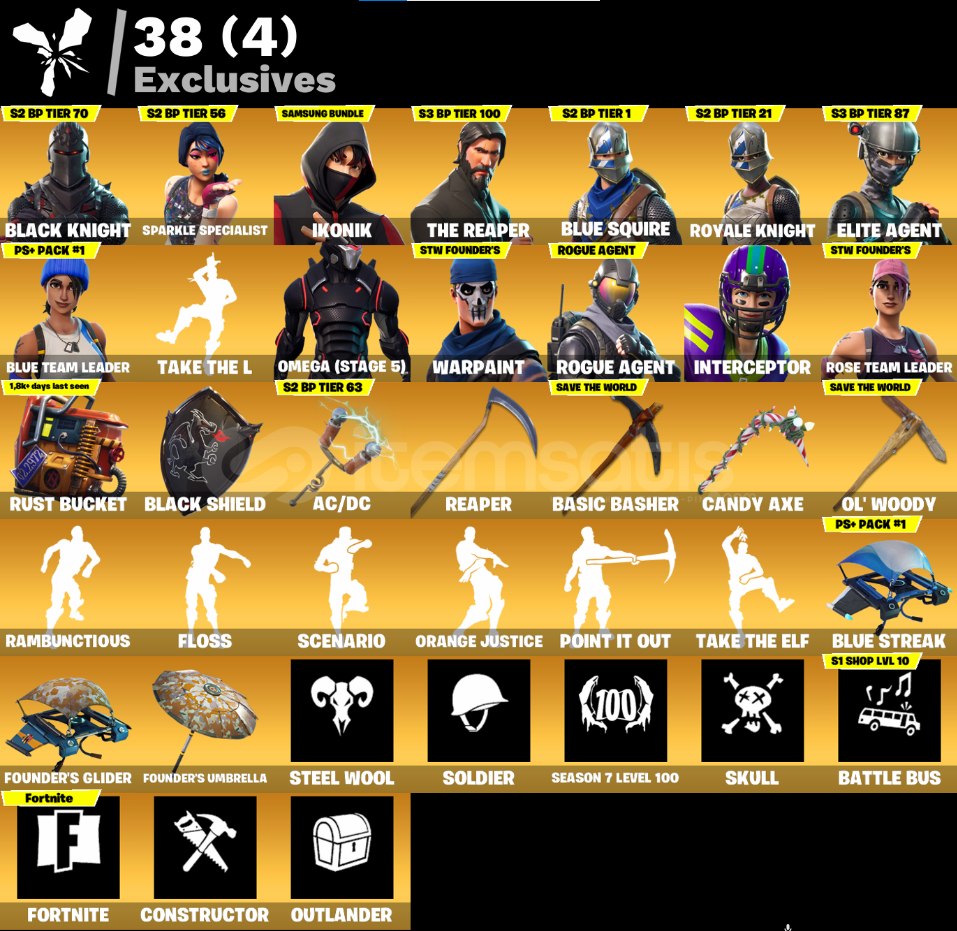 E-posta ile birlikte teslim edilir — E-posta erişimi tamamen size verilecektir.Ömür boyu garanti — Hesapla ilgili herhangi bir sorun olursa destek sağlanır.Tam erişim — Giriş bilgileri ve tüm hesap detayları verilecektir.İçerik — 203 kostüm ve 203 dans:Black Knight (nadir)iKONIK (ikonik)Take The L & The Reaper (S2–S3)AC/DC & Scenario & Candy Axe (nadir pickaxe’ler)Omega fullendi (tam sezon 4)Sezon 3...