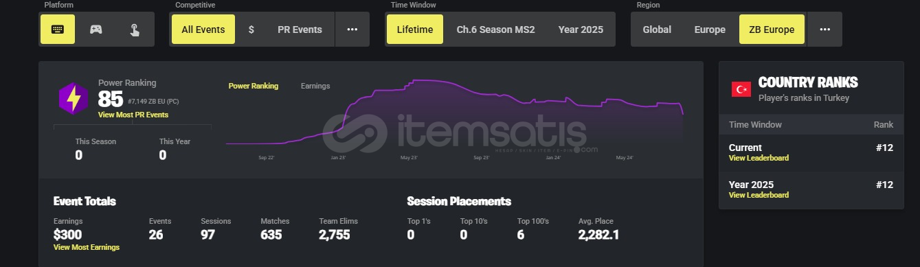 Hesabın şimdiye kadarki tek sahibiyim ve CHAPTER 1 SEZON 5'den beri aktif olarak kullanmaktayım. Hesapta CHAPTER 1 SEZON 6 dan itibaren olan bütün battle passler bulunmaktadır. (6. sezon battle passi 80. seviye kadar ancak geri kalan bütün sezonlar full). Ayrıca hesabın tracker'ı da dolu olup Battle Royale'de Lifetime 1529 pr'ı ve 3 top 100 sıralaması vardır. Sıfır İnşa'da ise lifetime 5518 pr, 300 dolar earnings ve 6 Top 100'ü bulunmaktadır. Hesapta ayrıca 1100 v-papel bulunmaktadır. Hesap denildiği gibi ömür boyu garantilidir ve herhangi bir sorunda yardımcı olunacaktır. Pazarlık vardır.