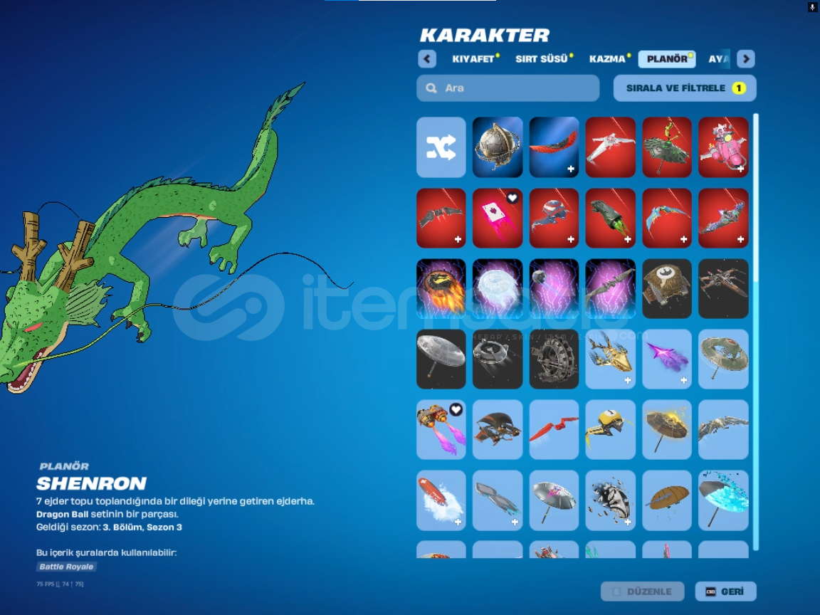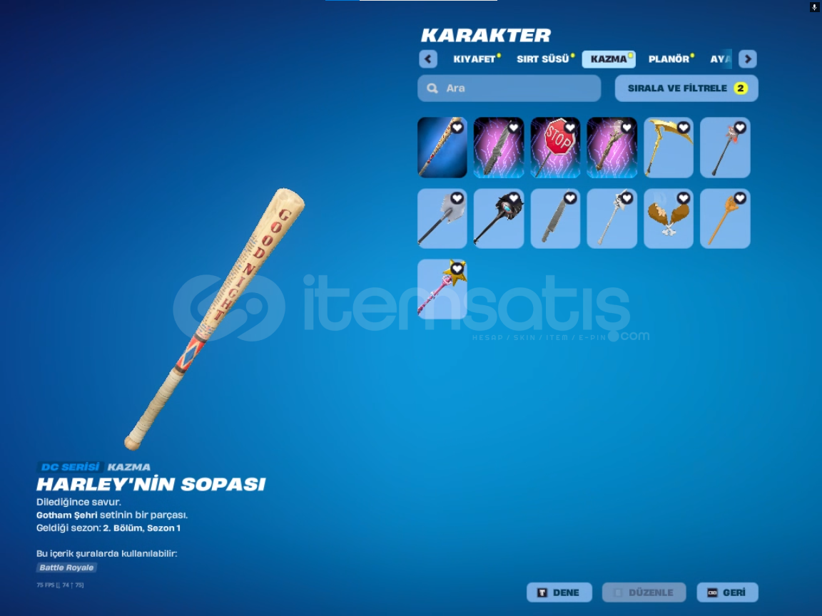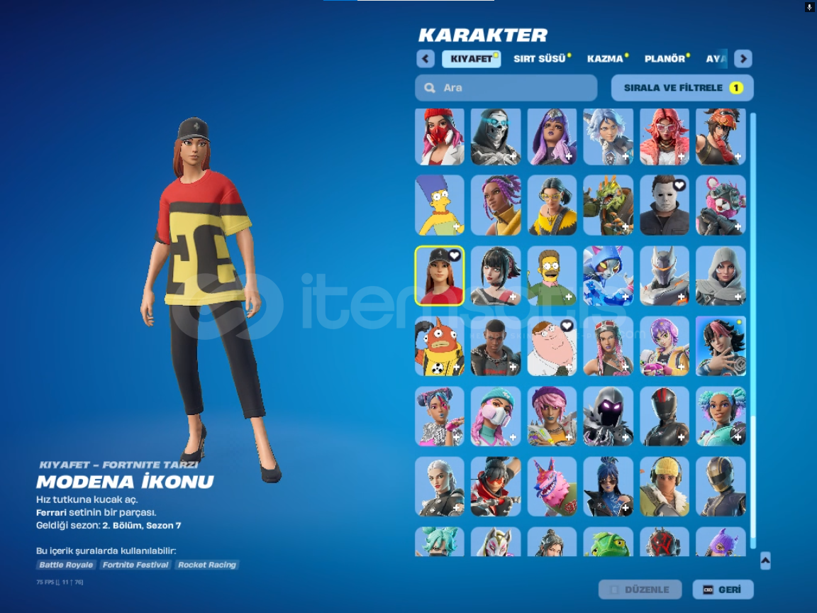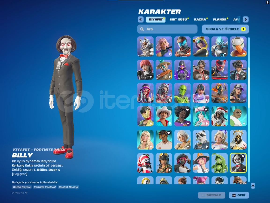 *kıyafet sayısı:144 *sırt süsü sayısı:196*kazma sayısı:172*planör sayısı:98*dalış izi:63*spor araba sayısı:9*SUV sayısı:*emote ve ifade sayısı:397hesabın ilk sahibi benim el değişmedi. çoğu starter pack alınmıştır 6 7 tryhard pickaxe vardıralıcısını pişman etmiyecek sağlam bir hesaptır. şimdiden al...