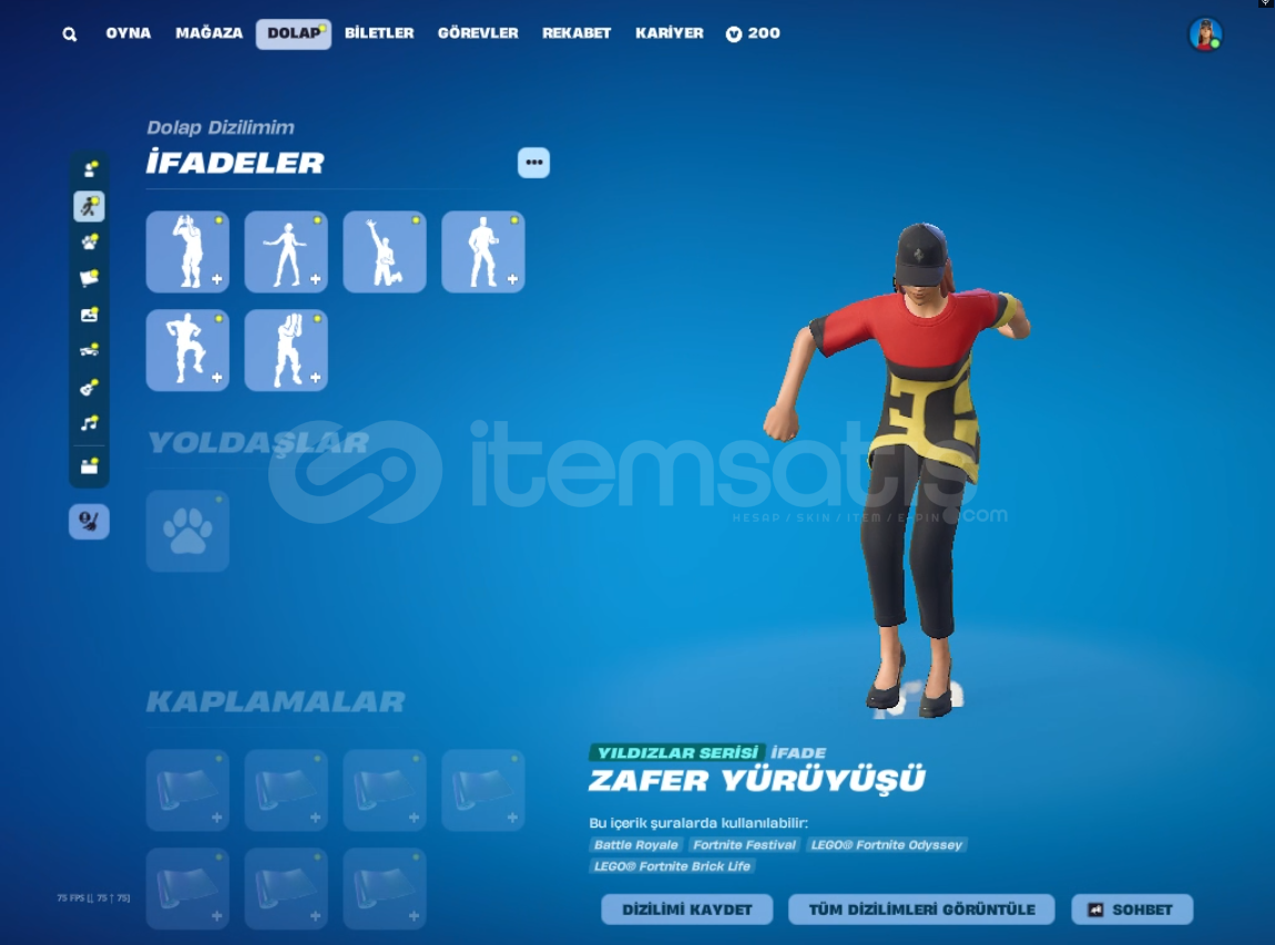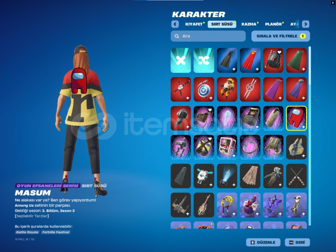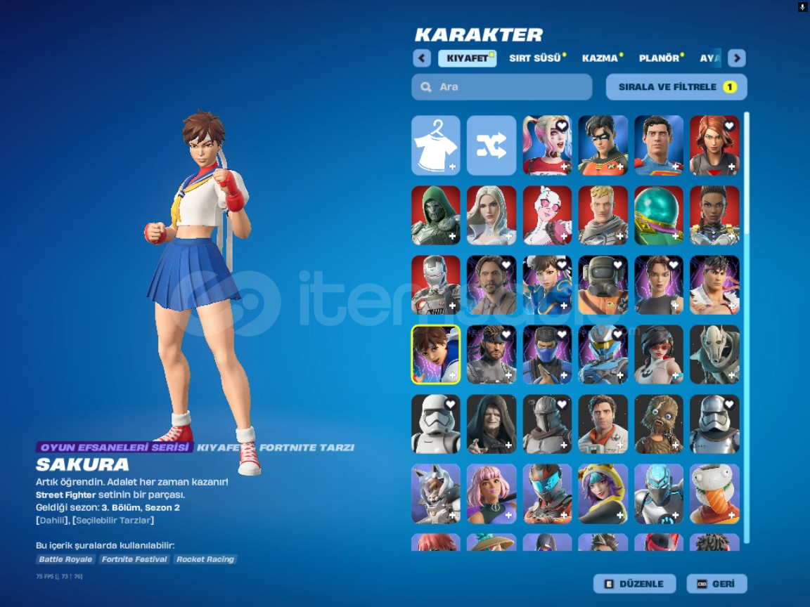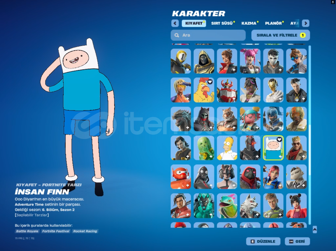 *kıyafet sayısı:144 *sırt süsü sayısı:196*kazma sayısı:172*planör sayısı:98*dalış izi:63*spor araba sayısı:9*SUV sayısı:*emote ve ifade sayısı:397hesabın ilk sahibi benim el değişmedi. çoğu starter pack alınmıştır 6 7 tryhard pickaxe vardıralıcısını pişman etmiyecek sağlam bir hesaptır. şimdiden al...